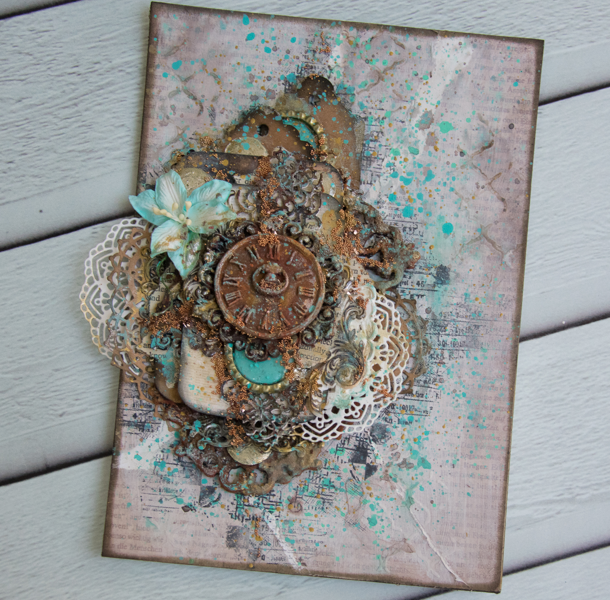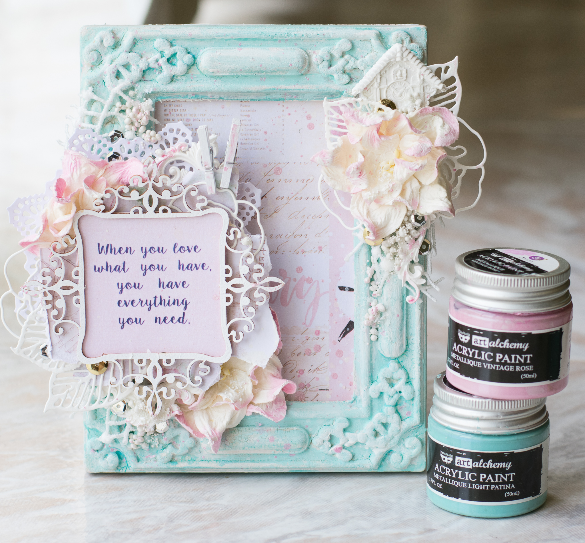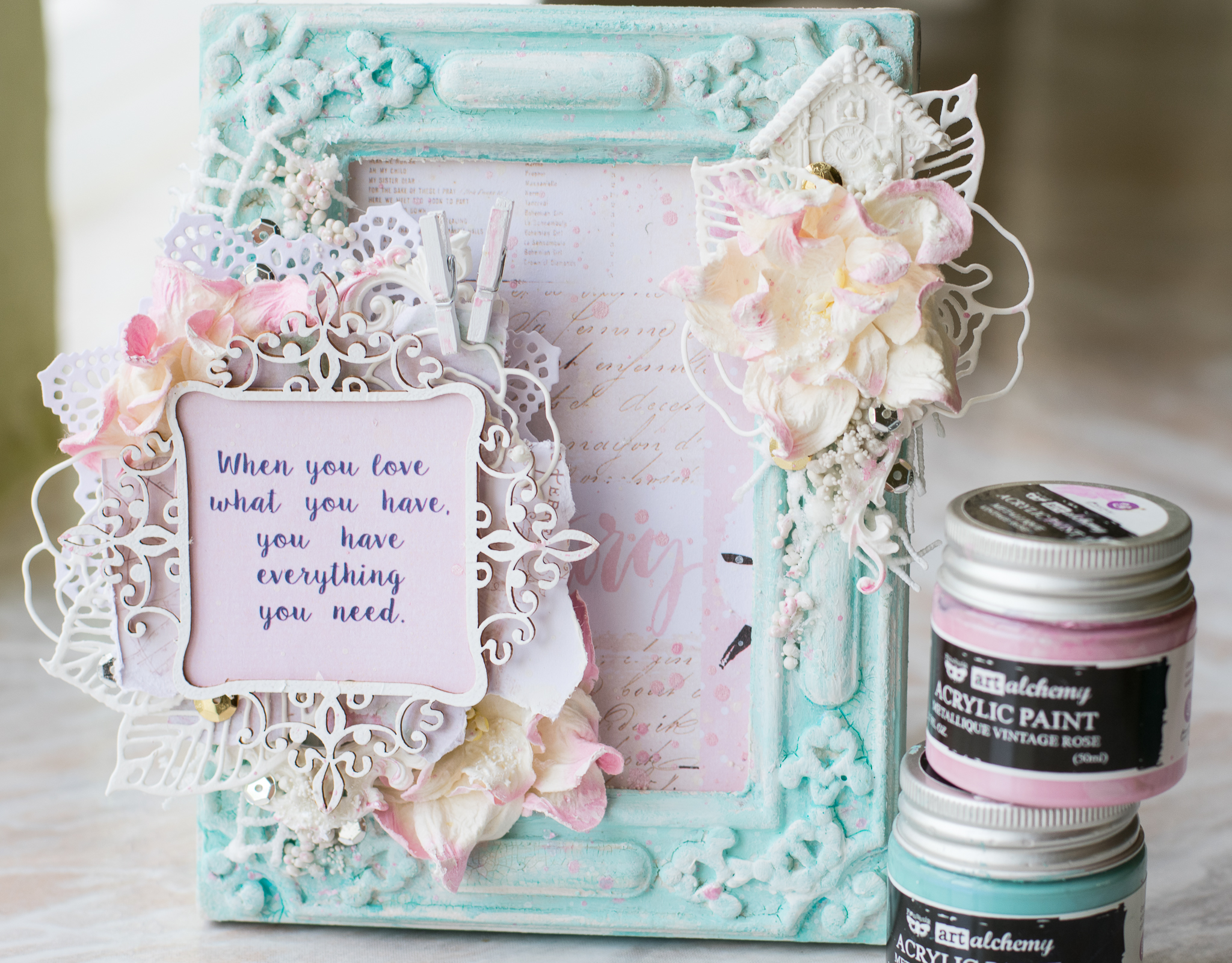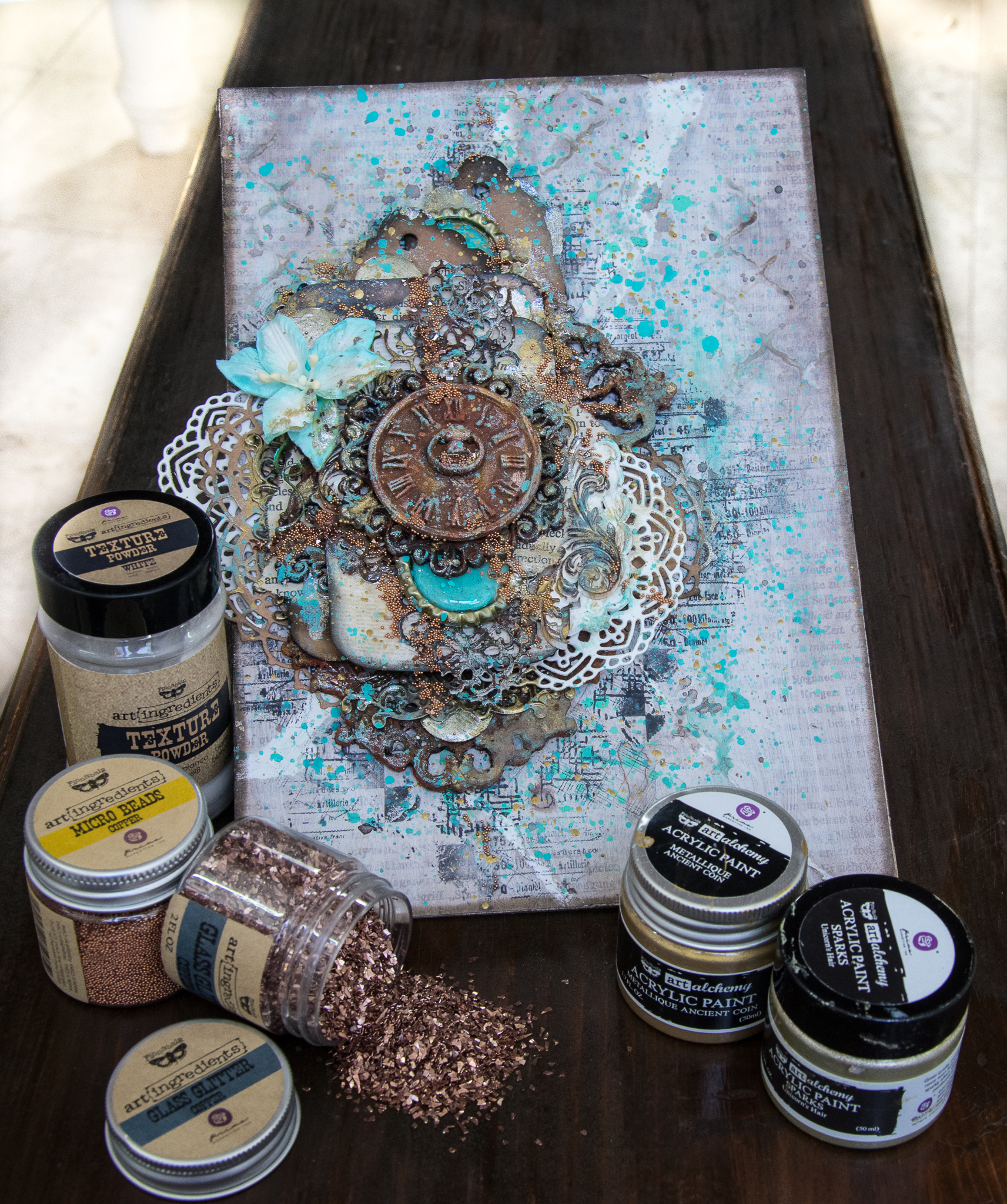 The frame is colored first with gesso, crackle glaze, acrylic art alchemy (light patina) and then gesso again to make a wash kind of look...