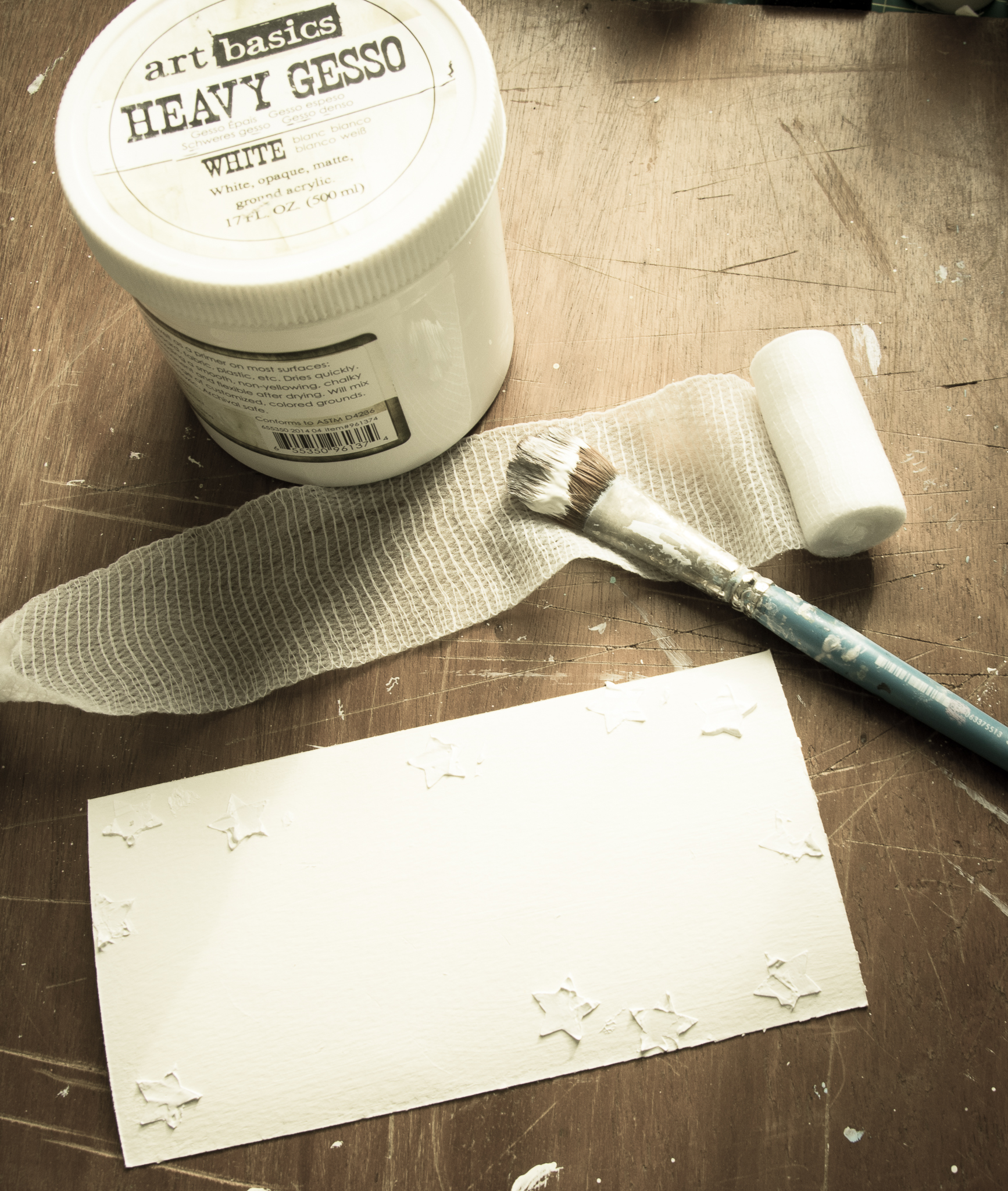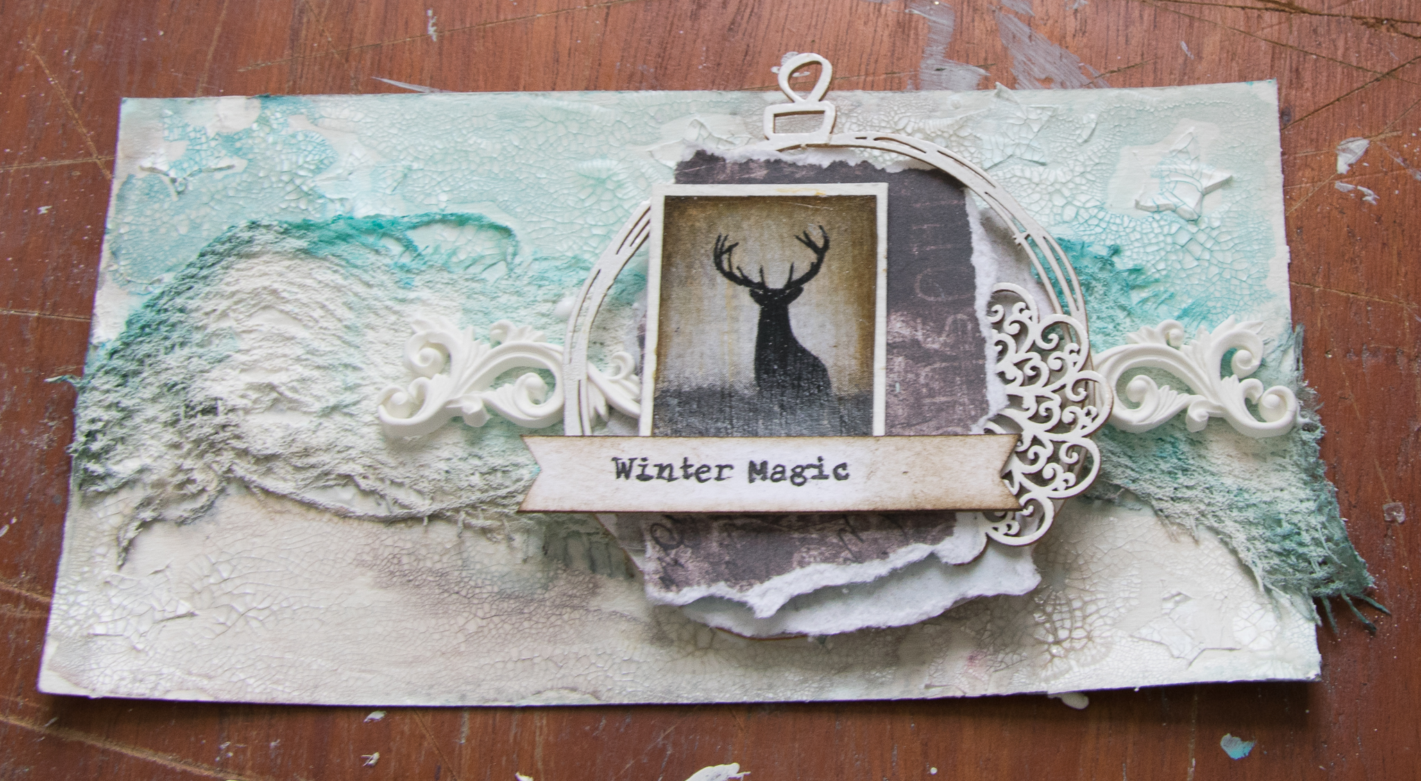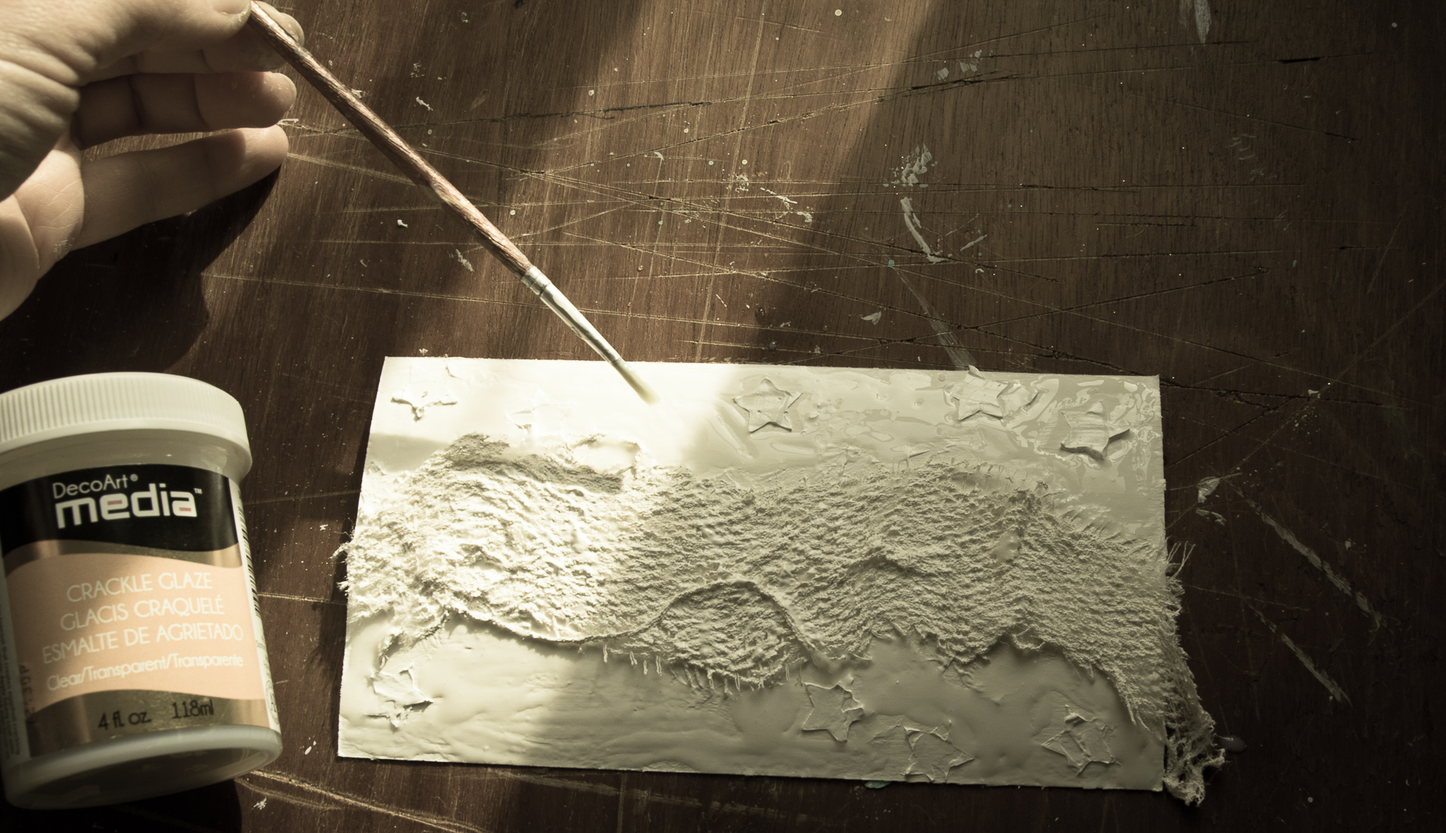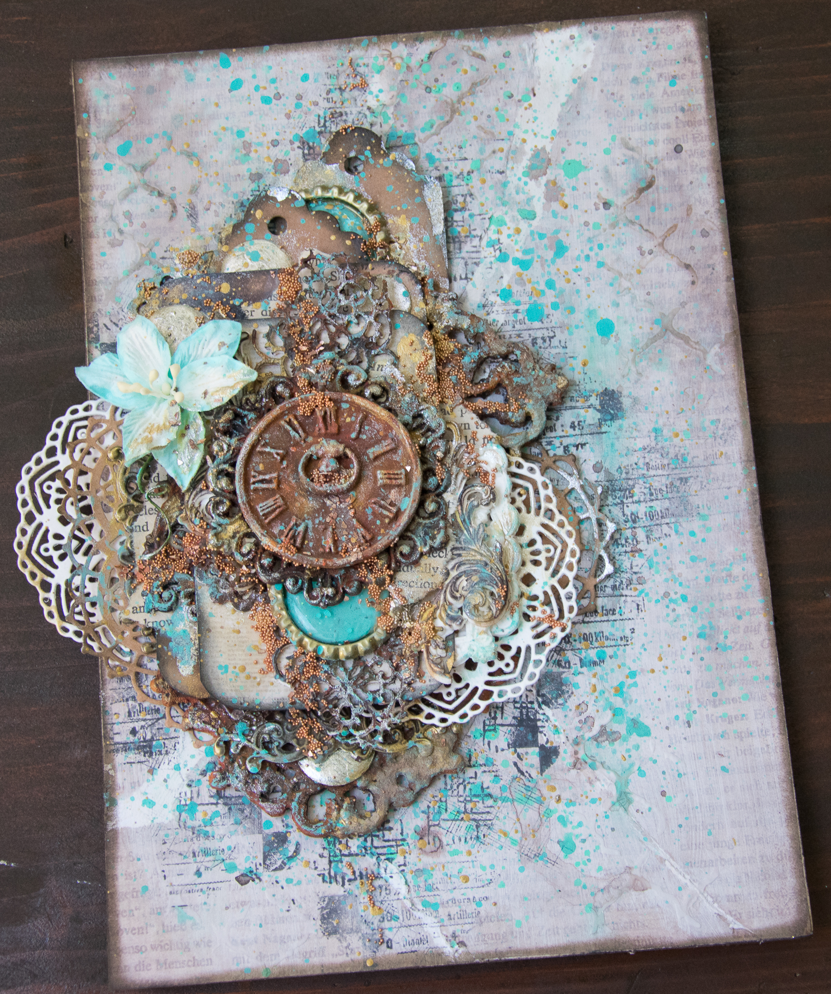 The frame is colored first with gesso, crackle glaze, acrylic art alchemy (light patina) and then gesso again to make a wash kind of look...