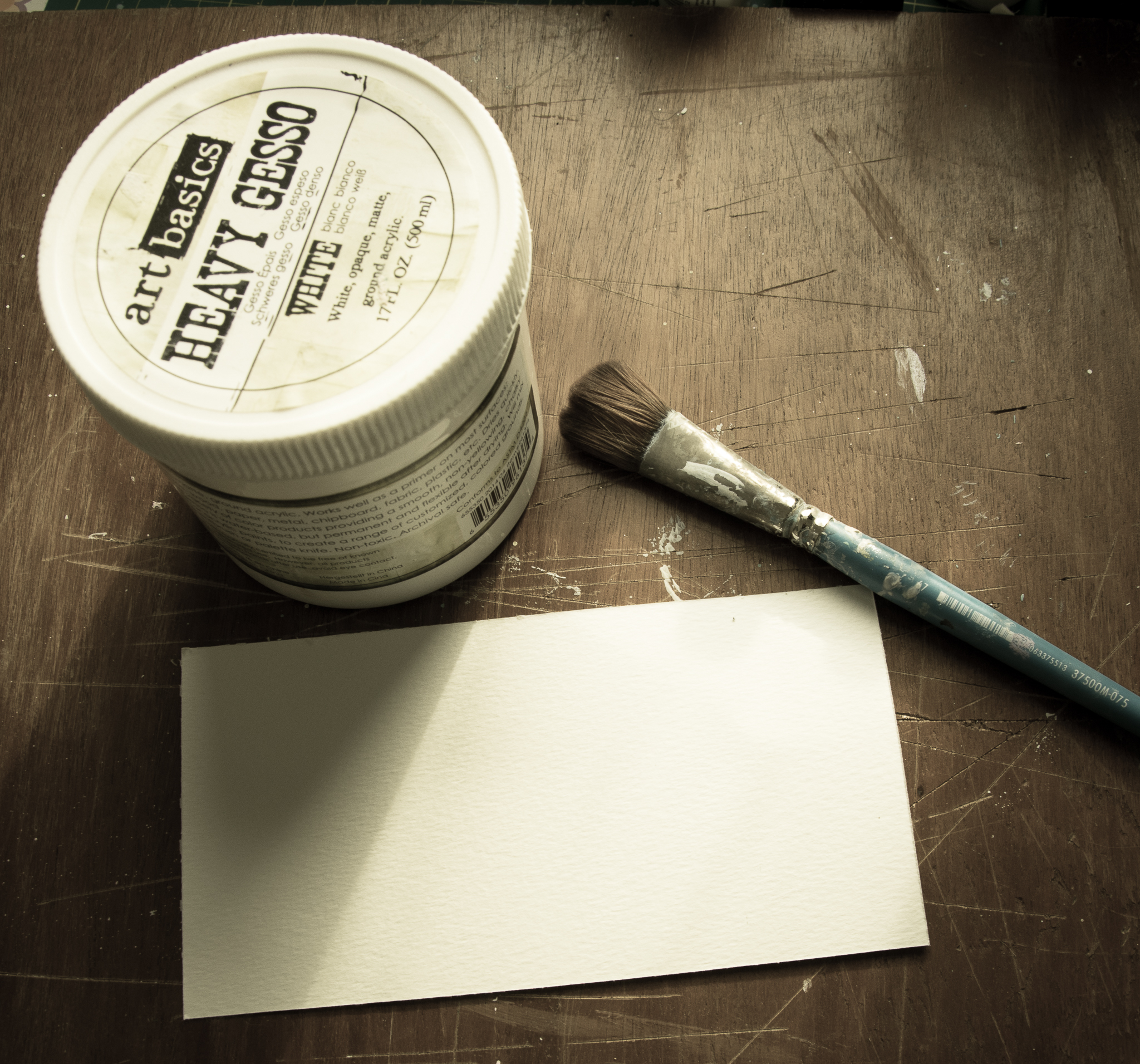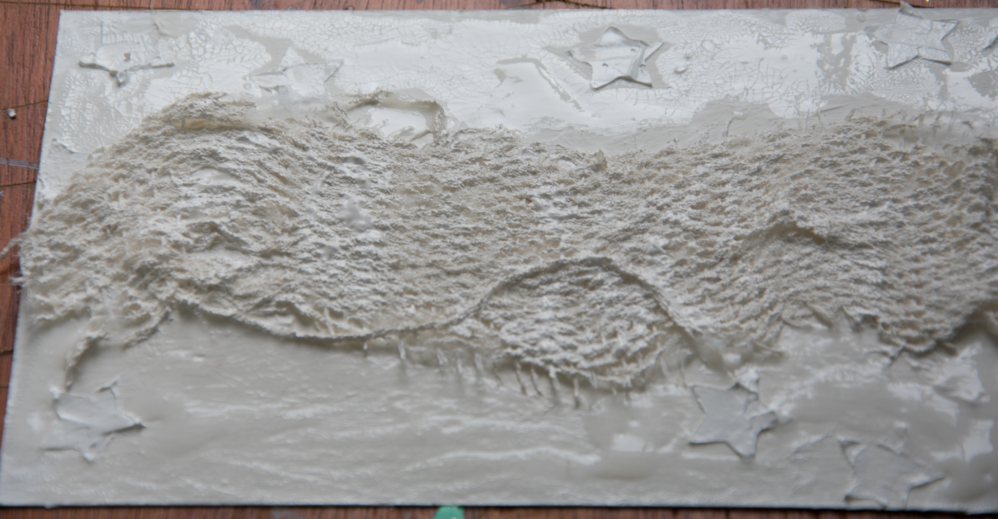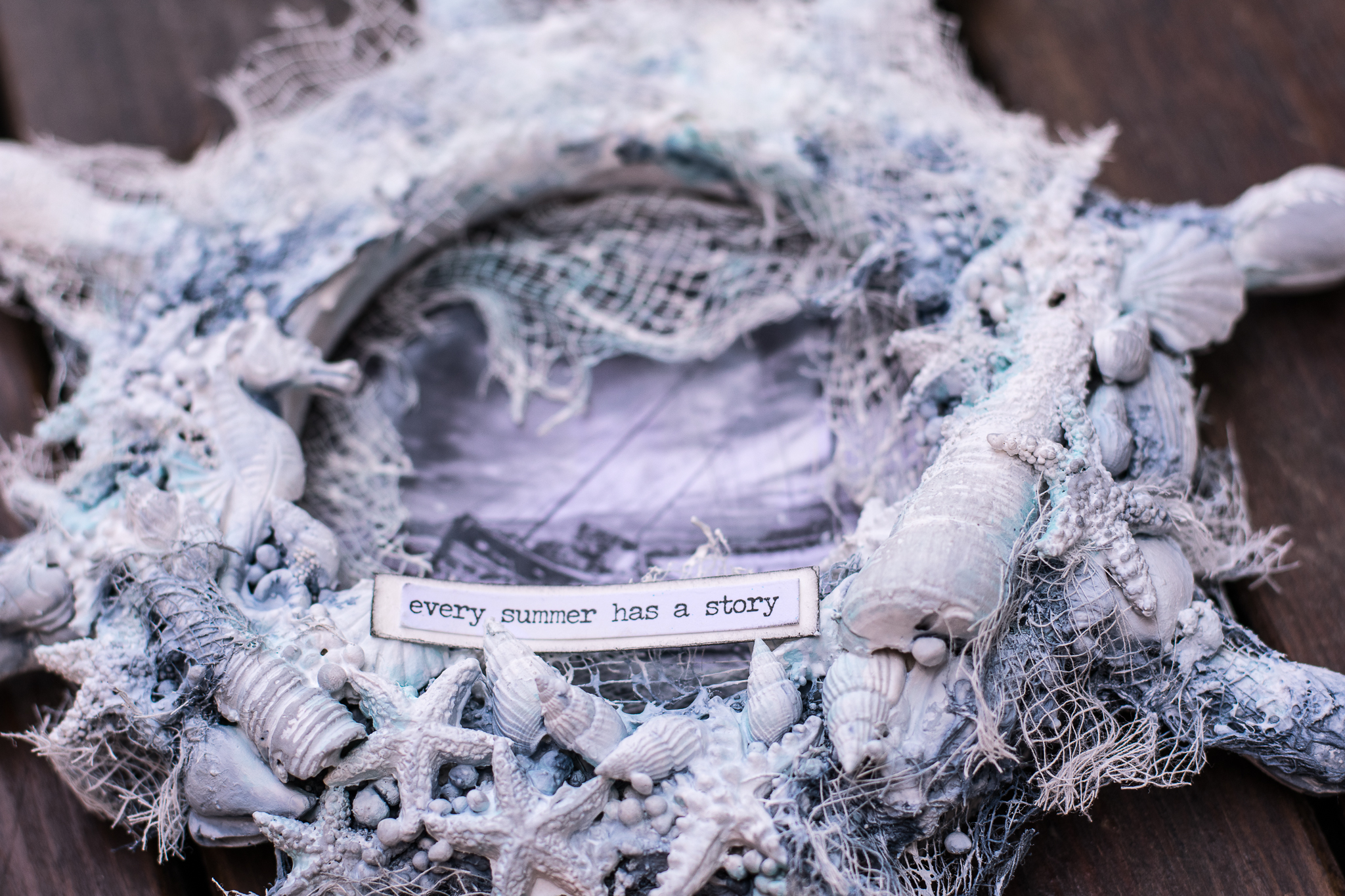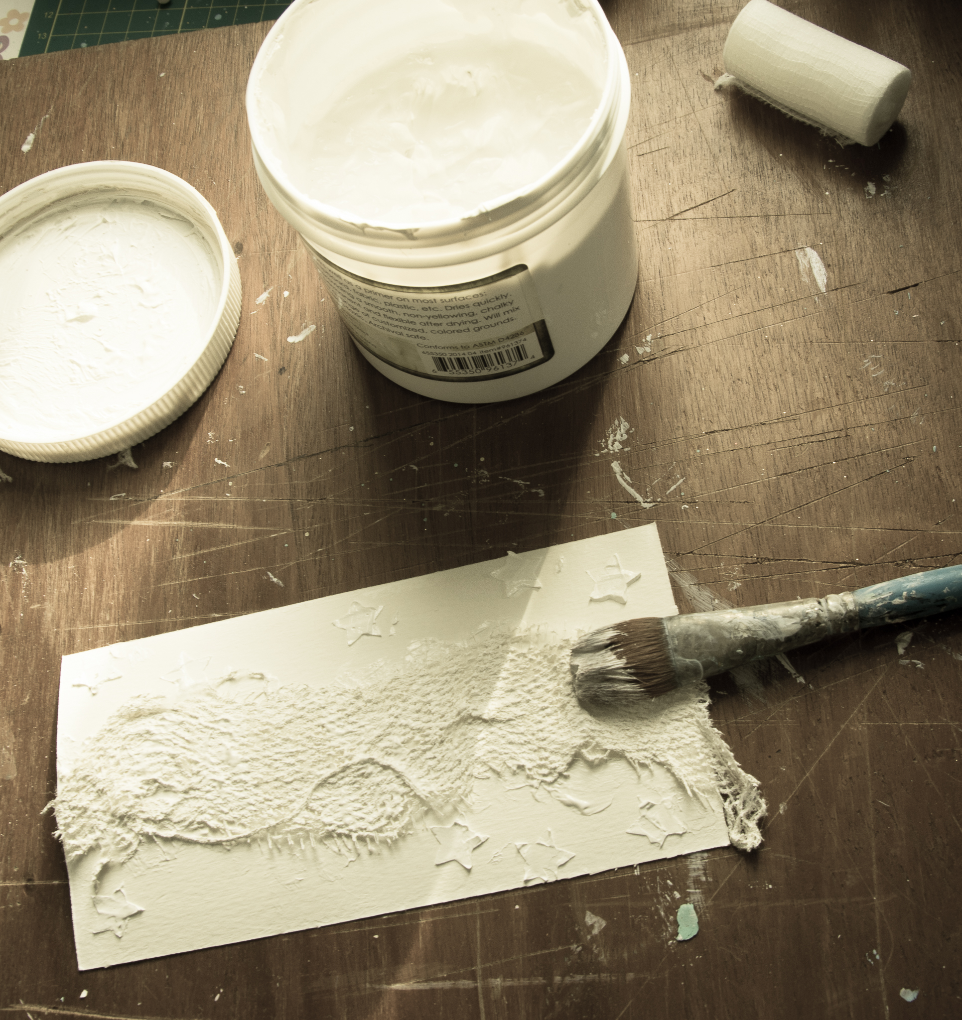 The frame is colored first with gesso, crackle glaze, acrylic art alchemy (light patina) and then gesso again to make a wash kind of look...