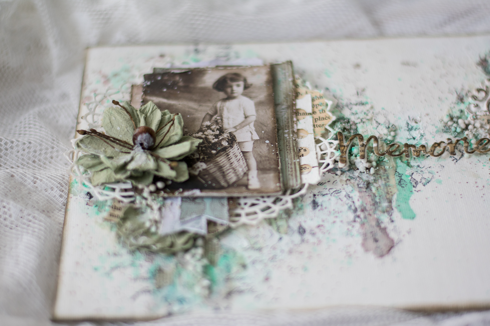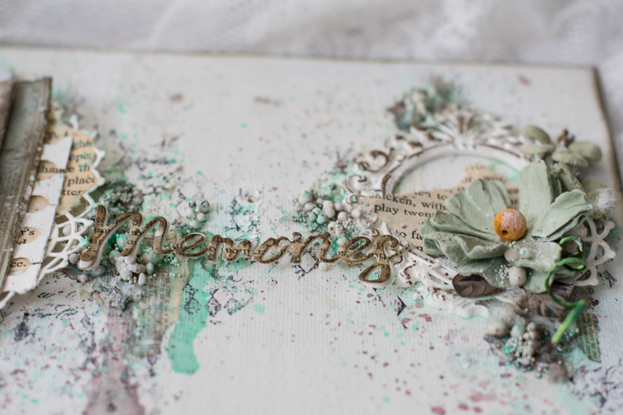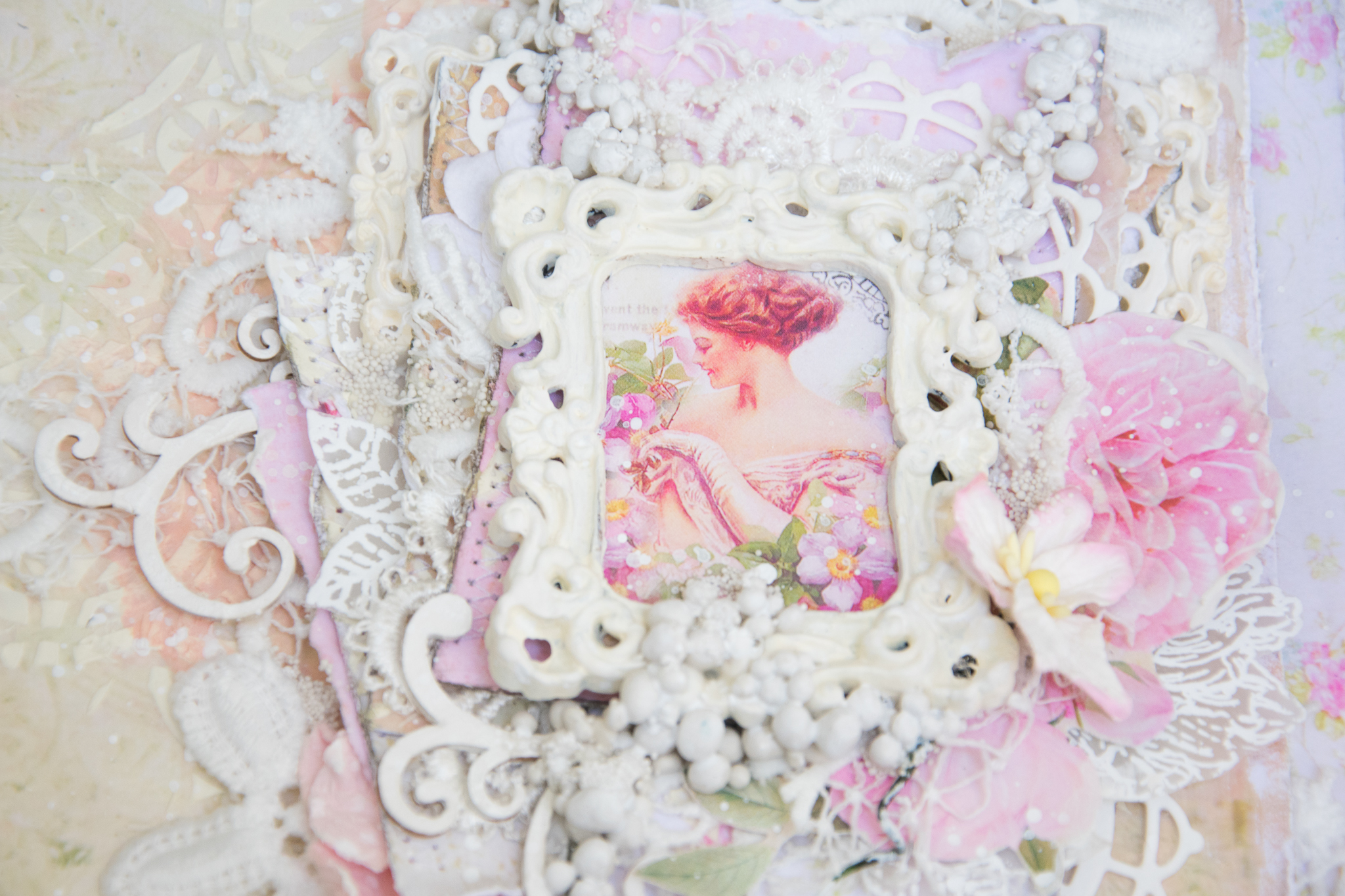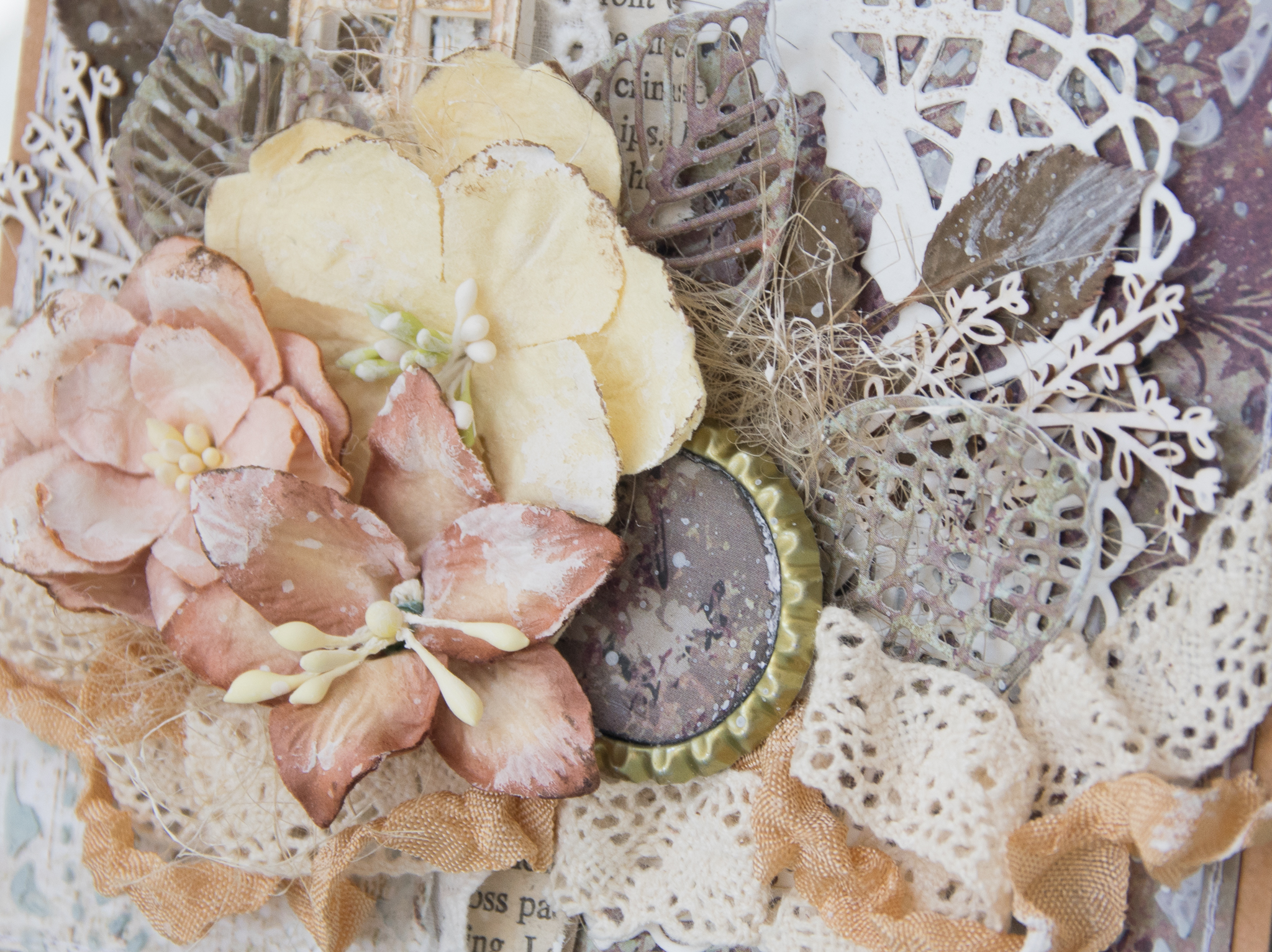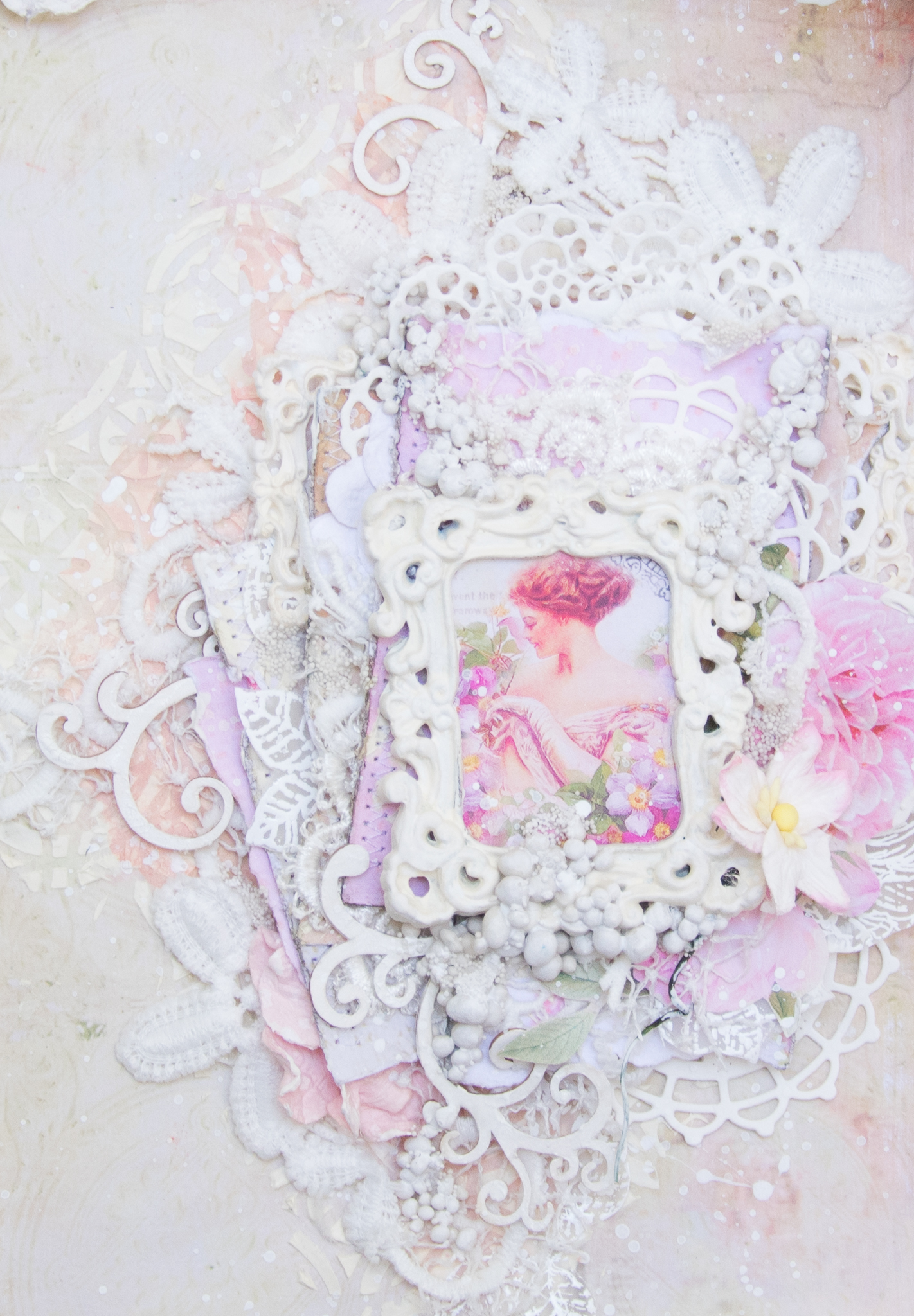 I framed the sentence with a white embossed chipboard, adding scraps paper, cuttings of leaves and flowers, molds and lace.