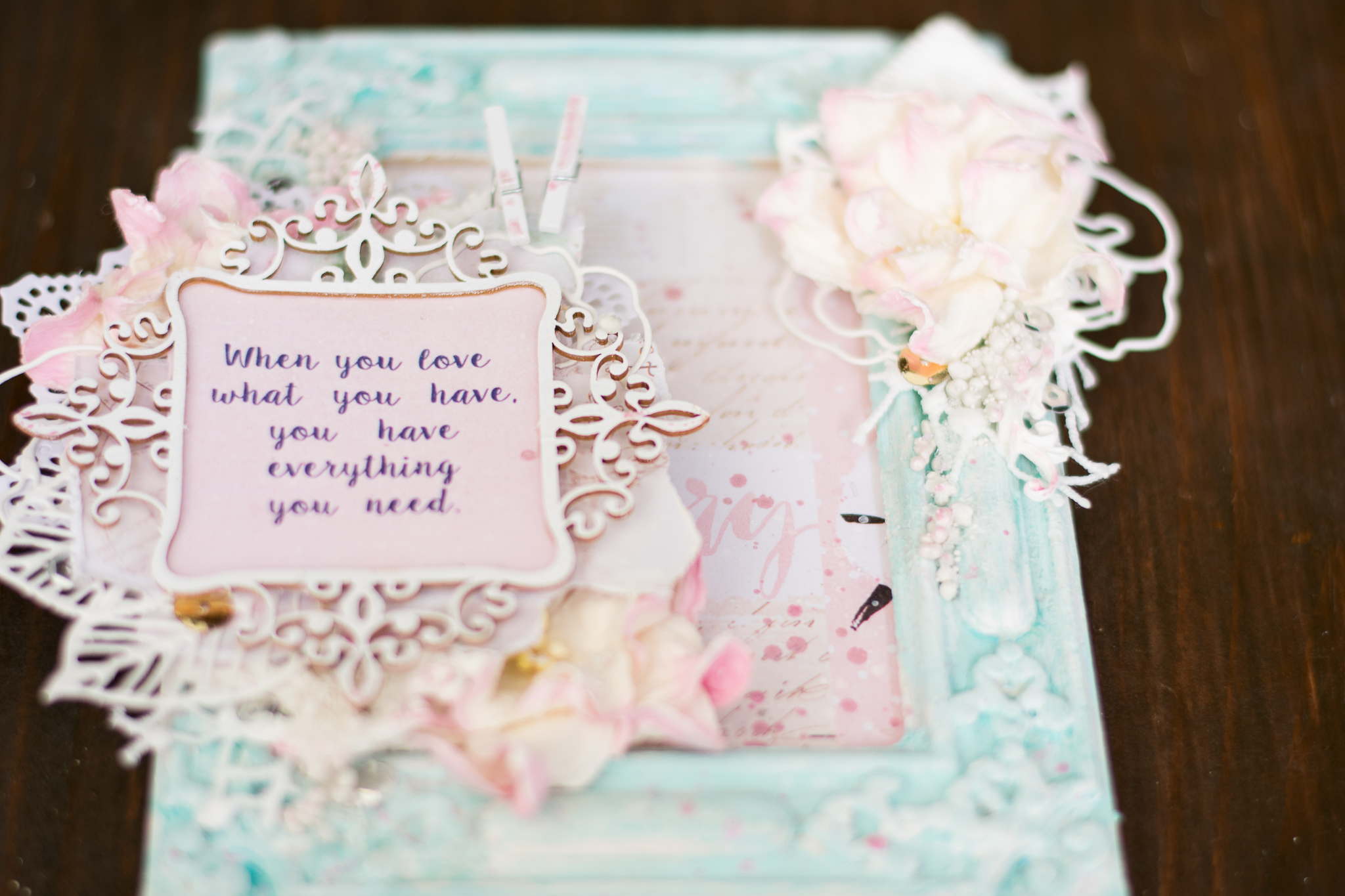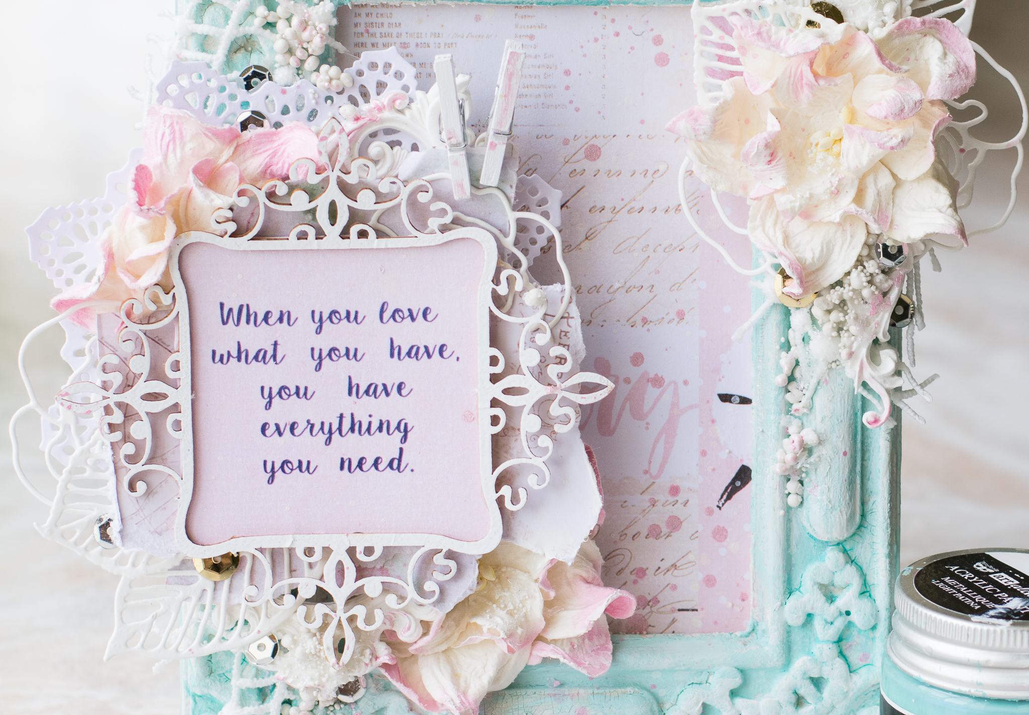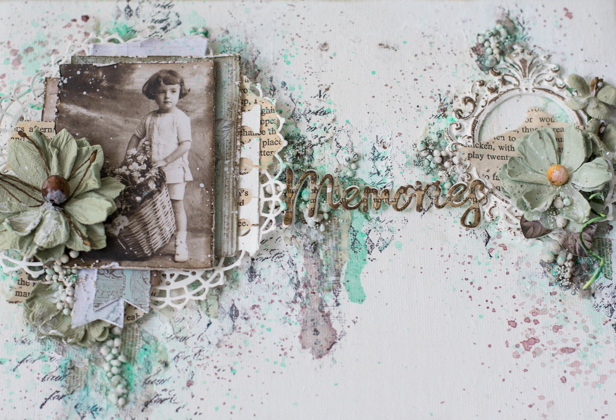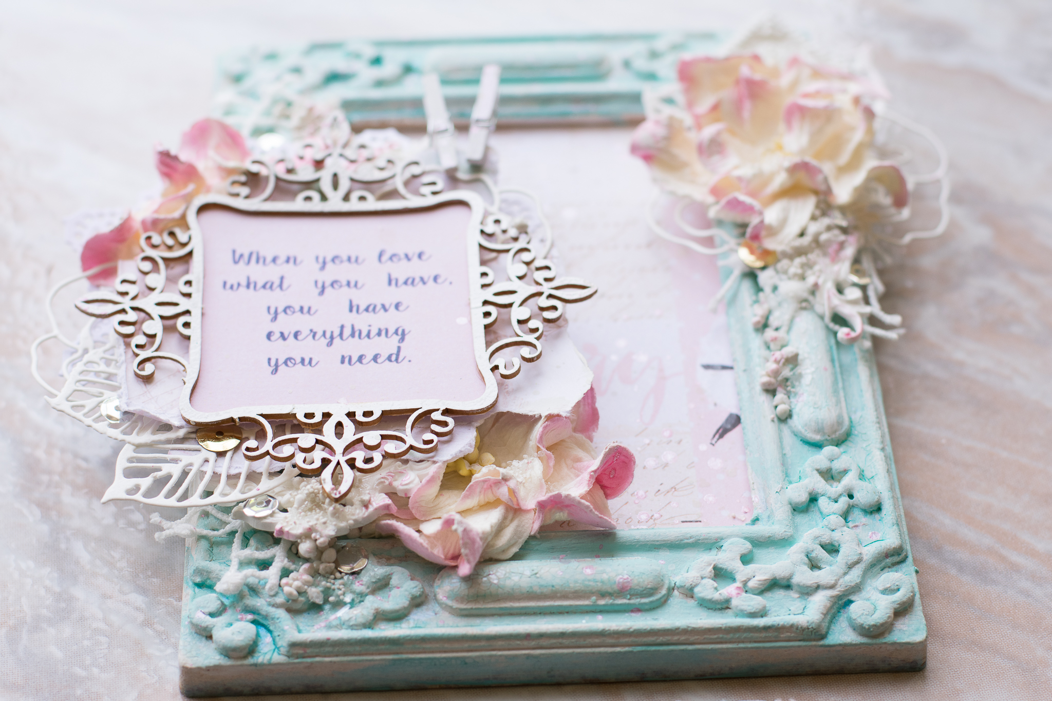 I framed the sentence with a white embossed chipboard, adding scraps paper, cuttings of leaves and flowers, molds and lace.