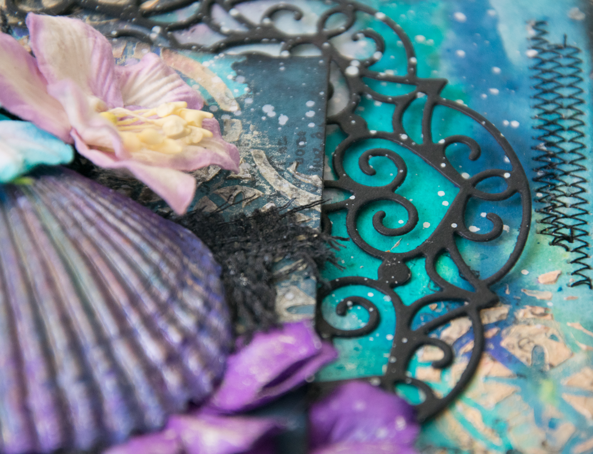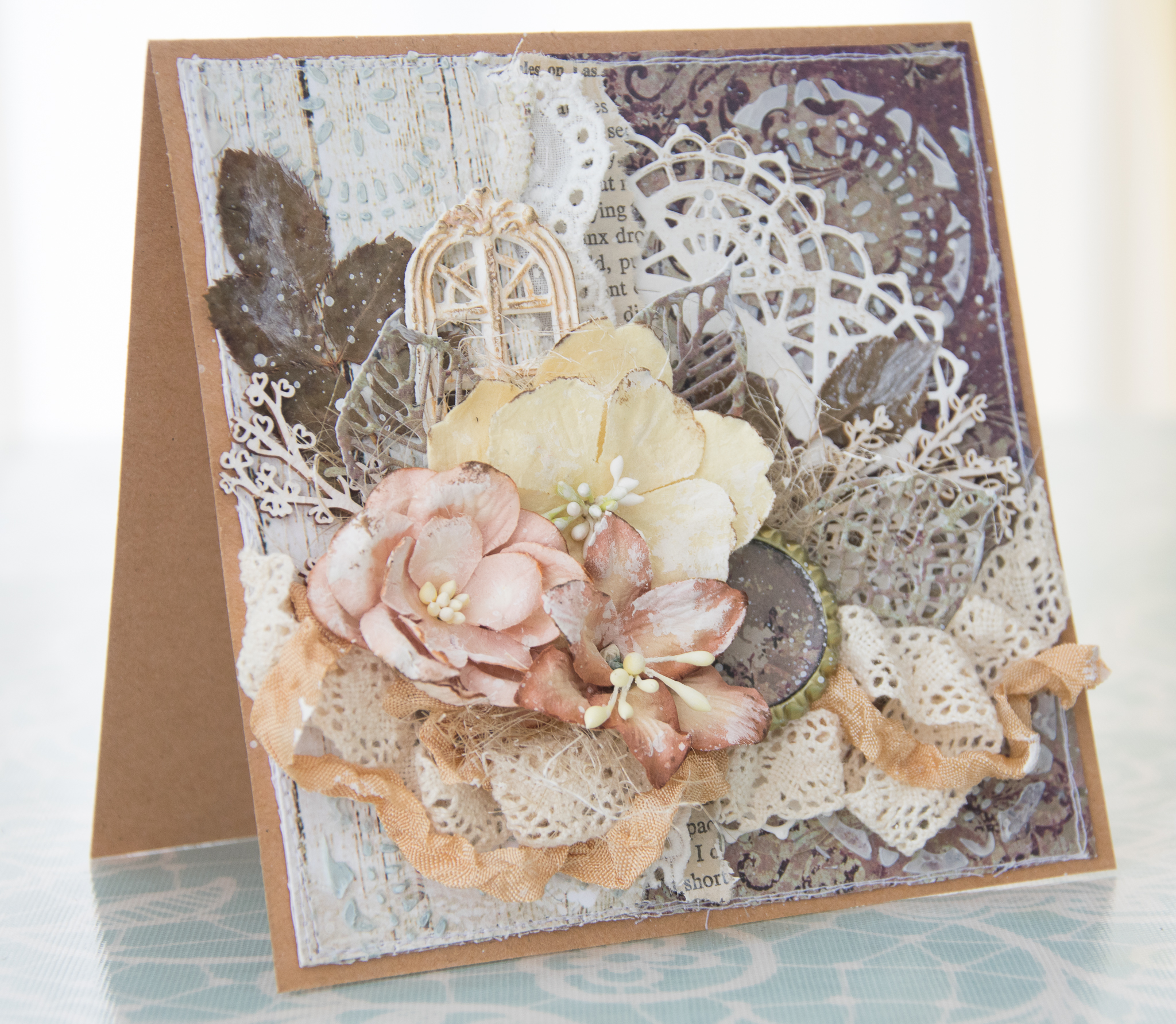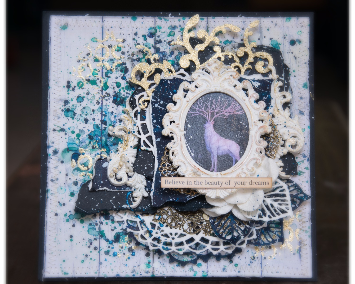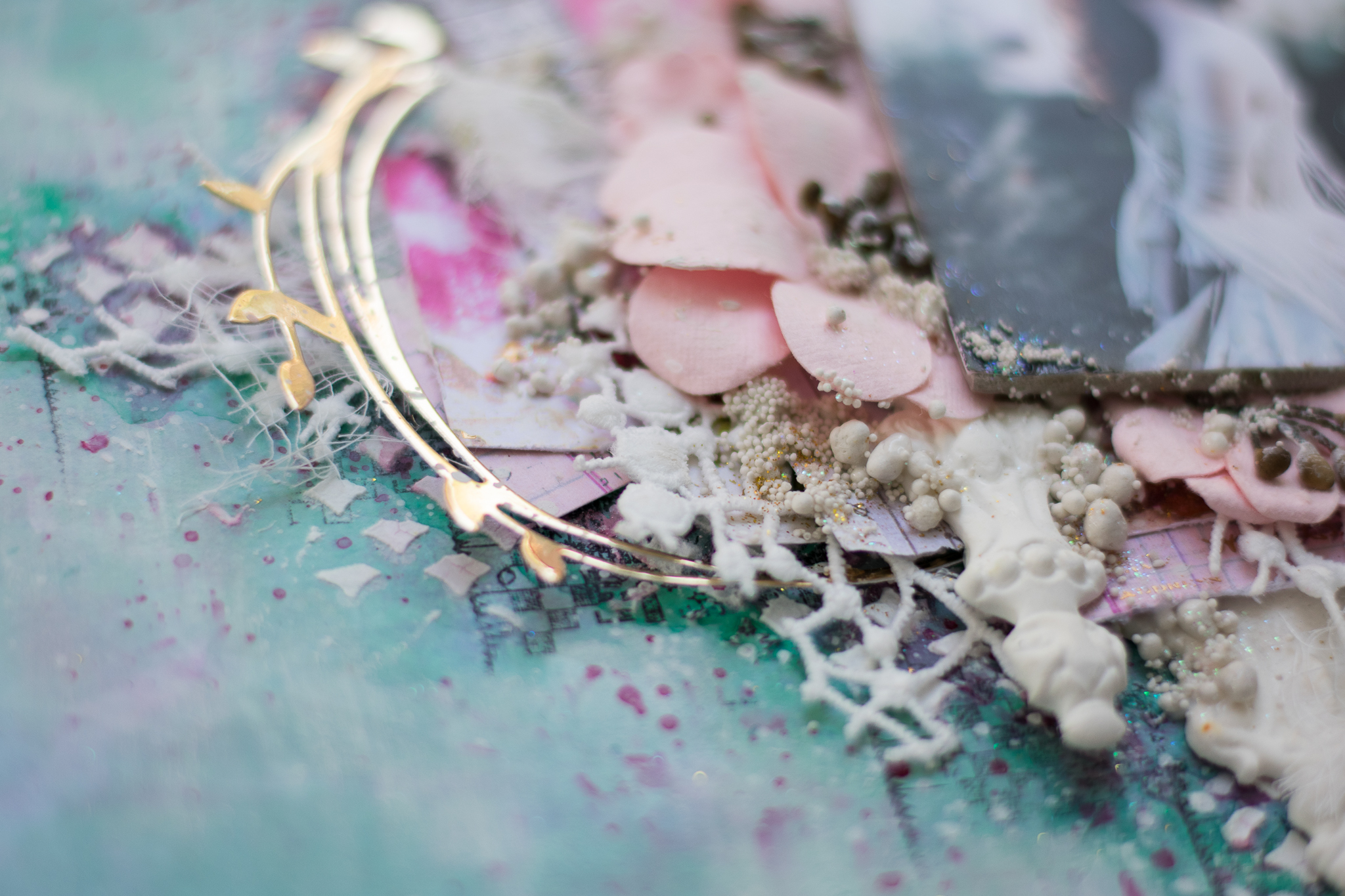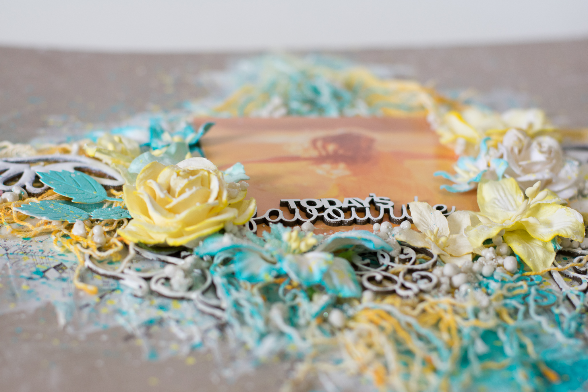 I framed the sentence with a white embossed chipboard, adding scraps paper, cuttings of leaves and flowers, molds and lace.