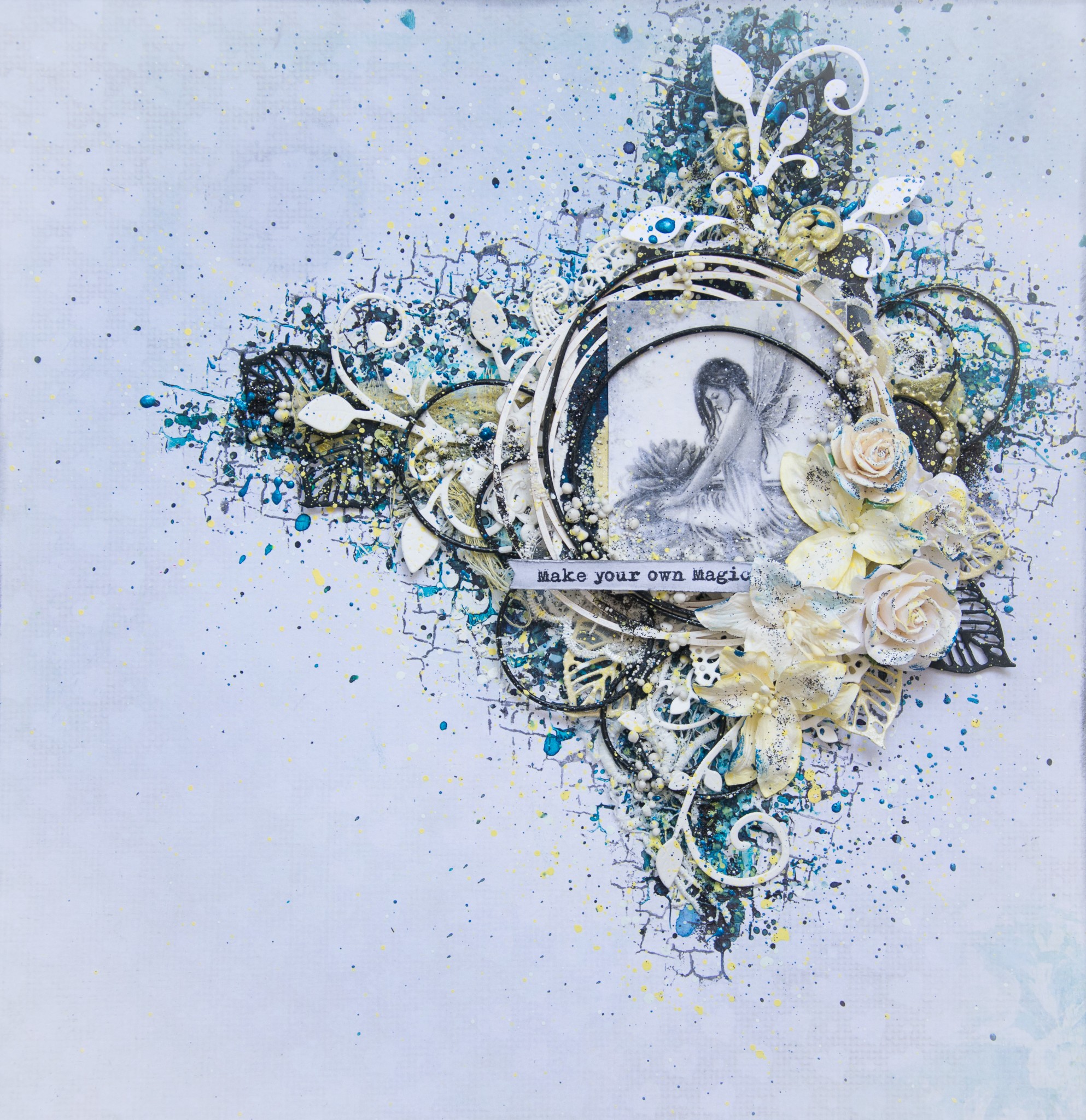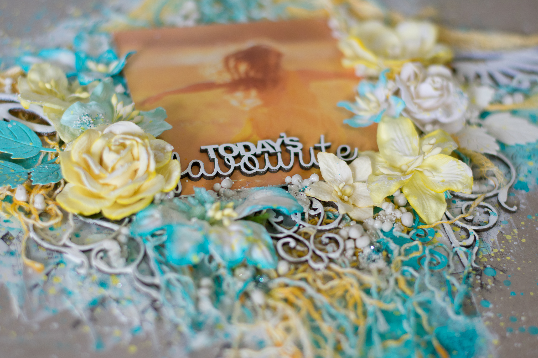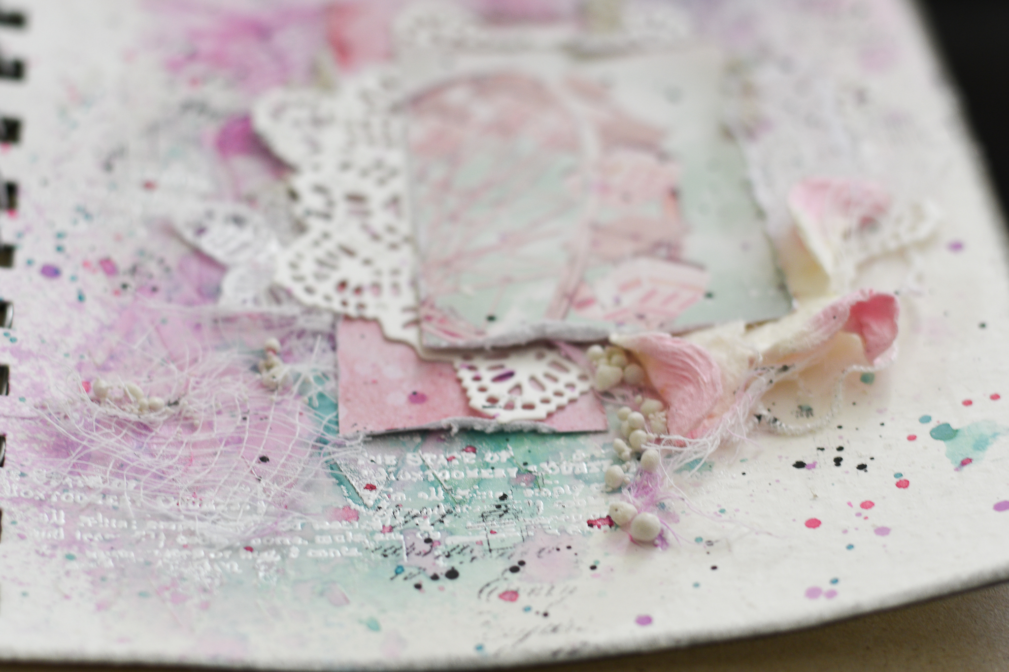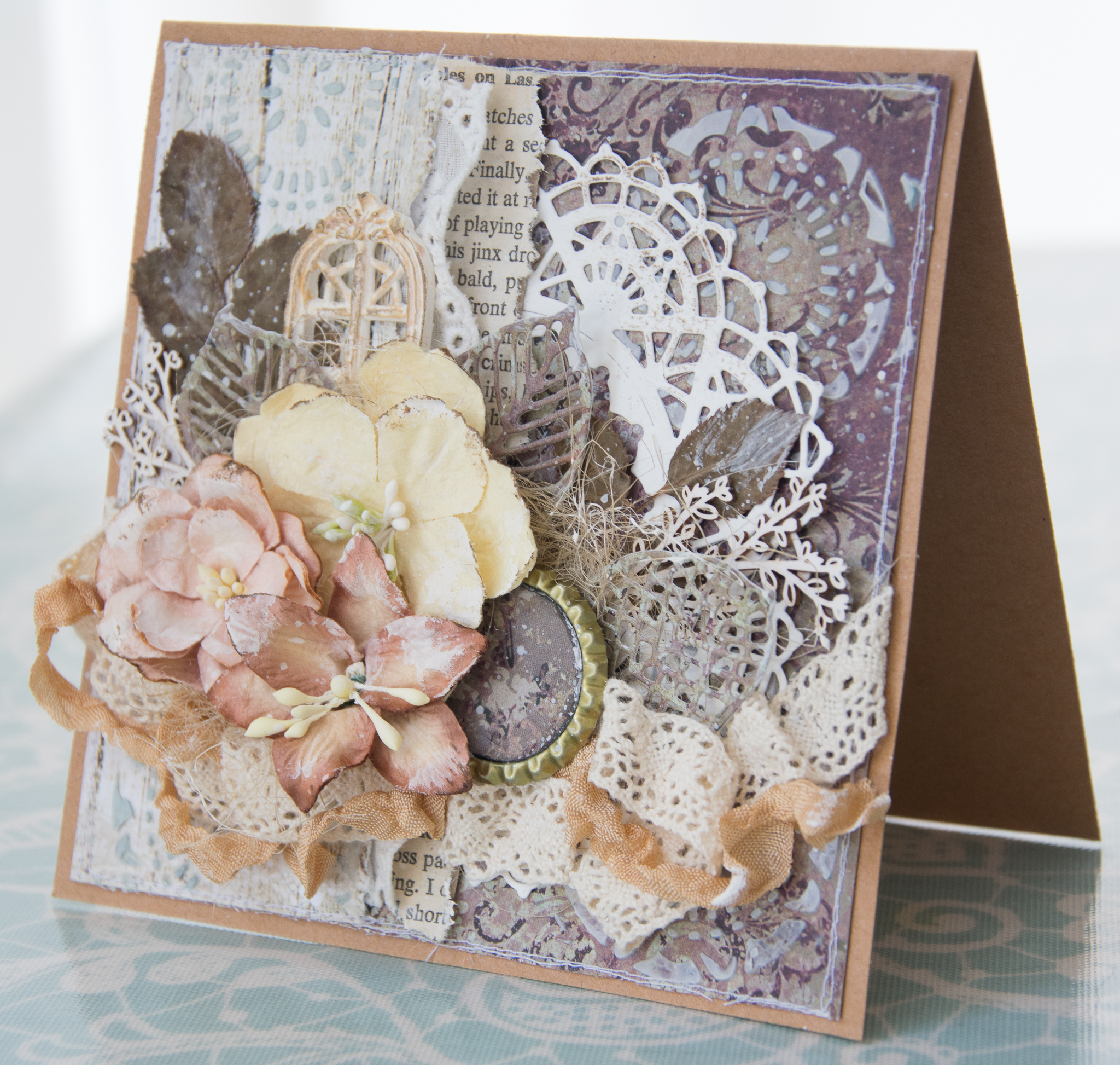 I framed the sentence with a white embossed chipboard, adding scraps paper, cuttings of leaves and flowers, molds and lace.