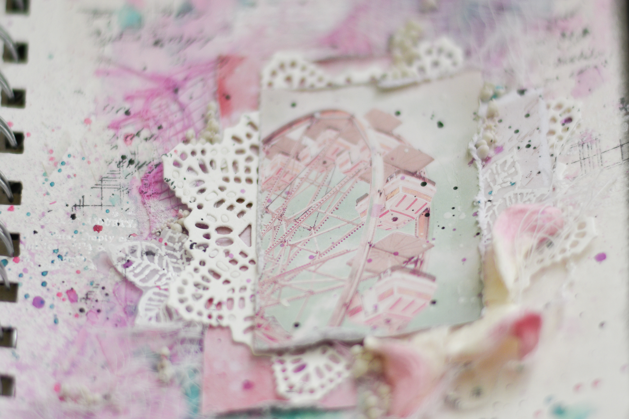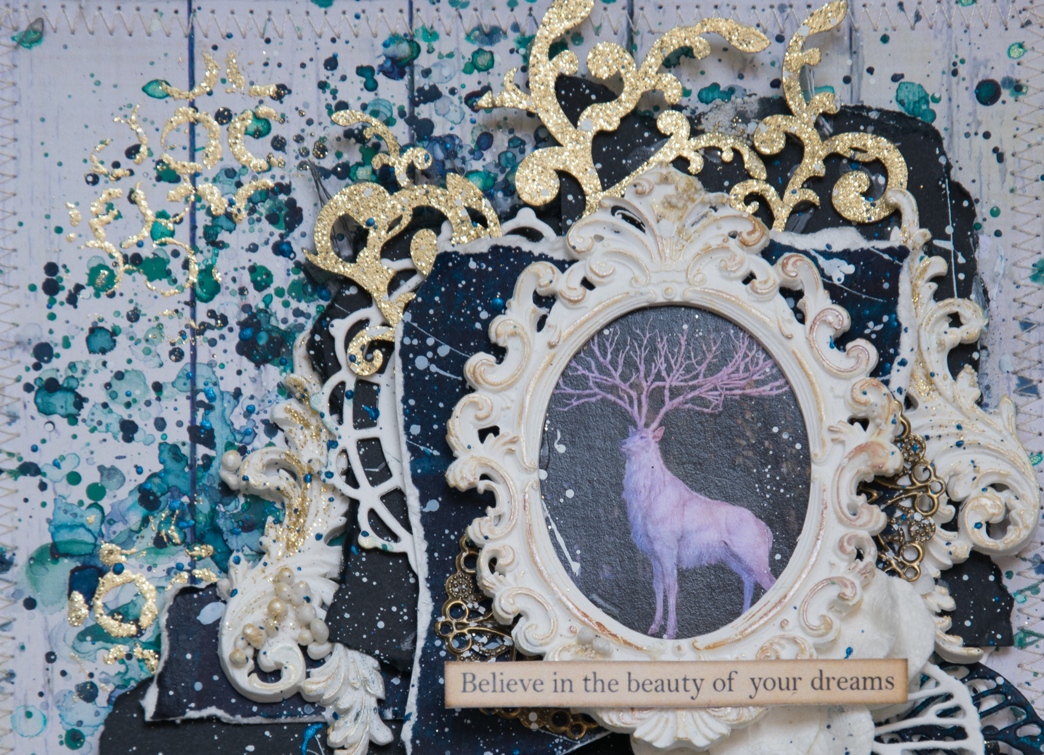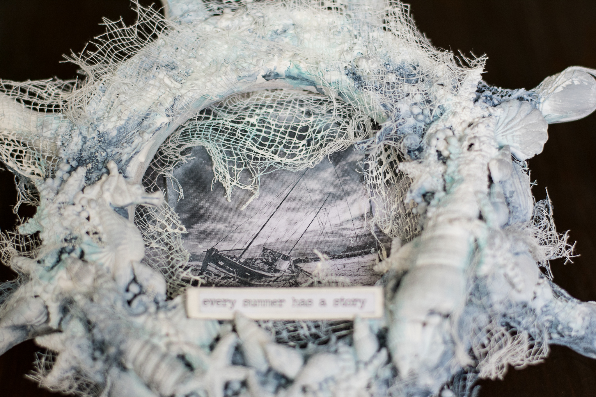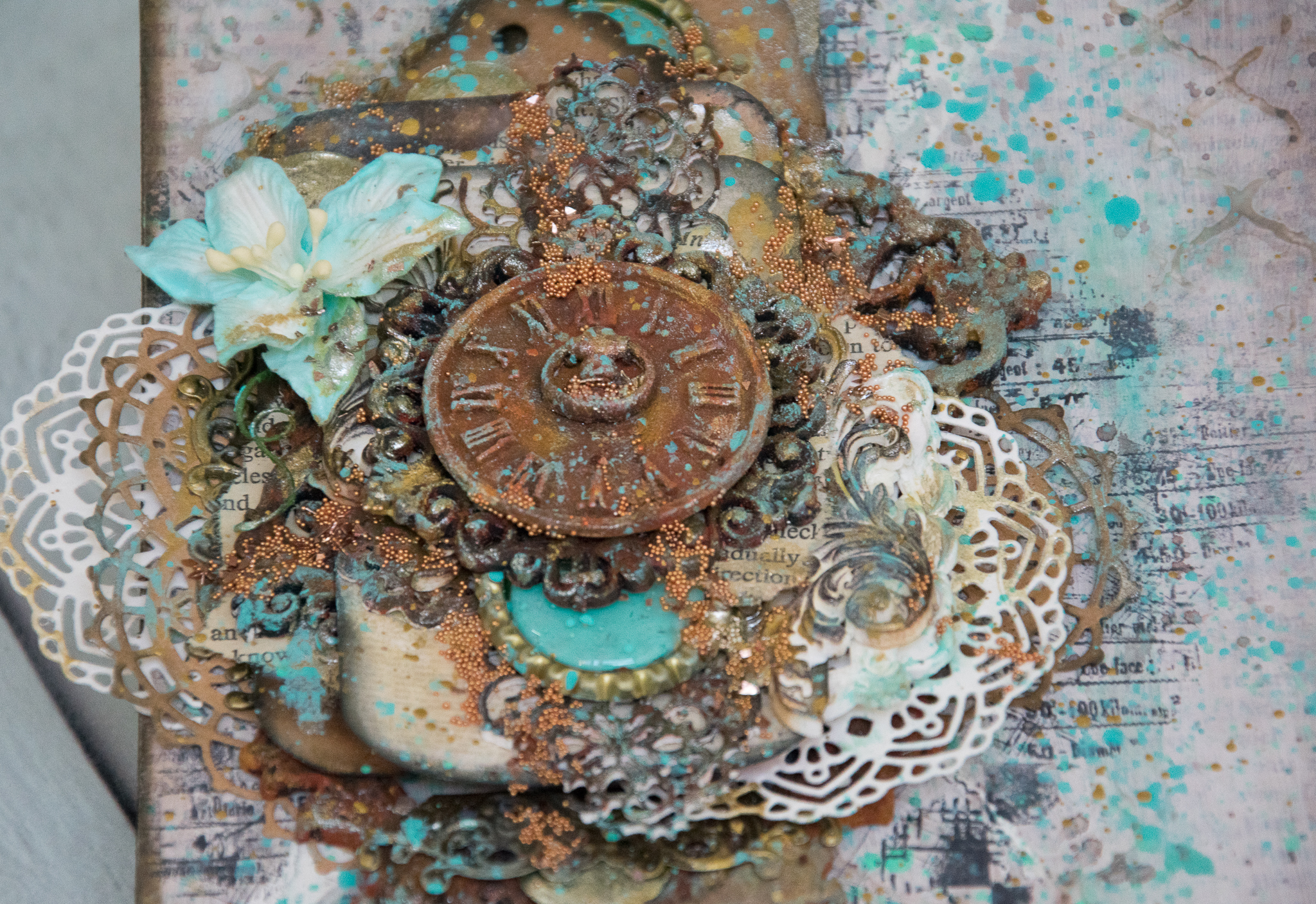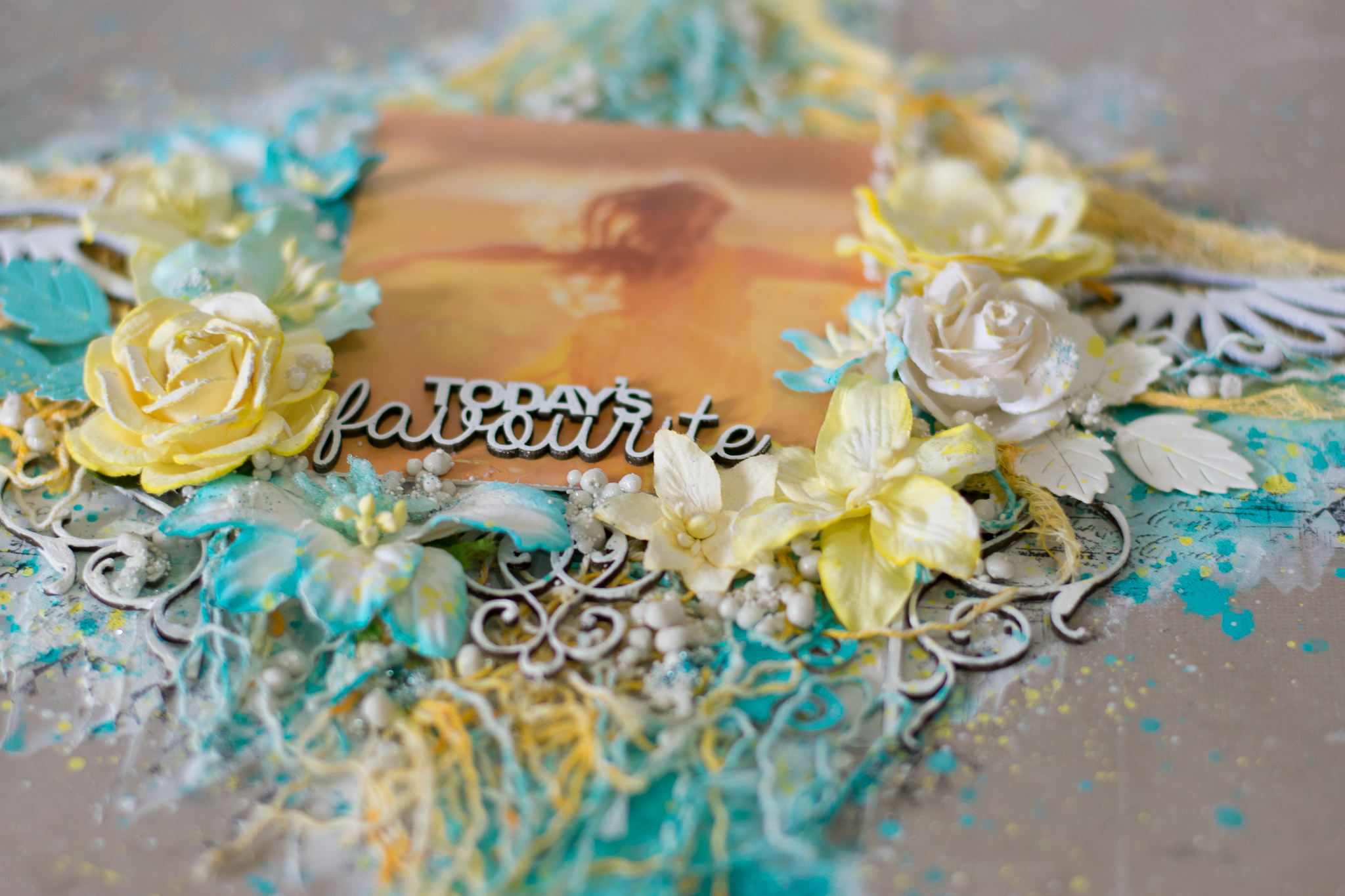 I framed the sentence with a white embossed chipboard, adding scraps paper, cuttings of leaves and flowers, molds and lace.