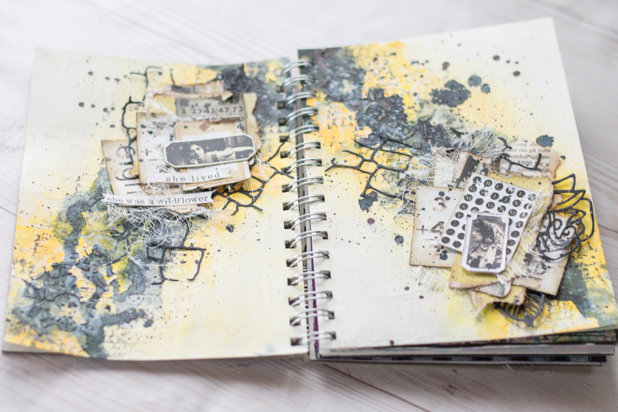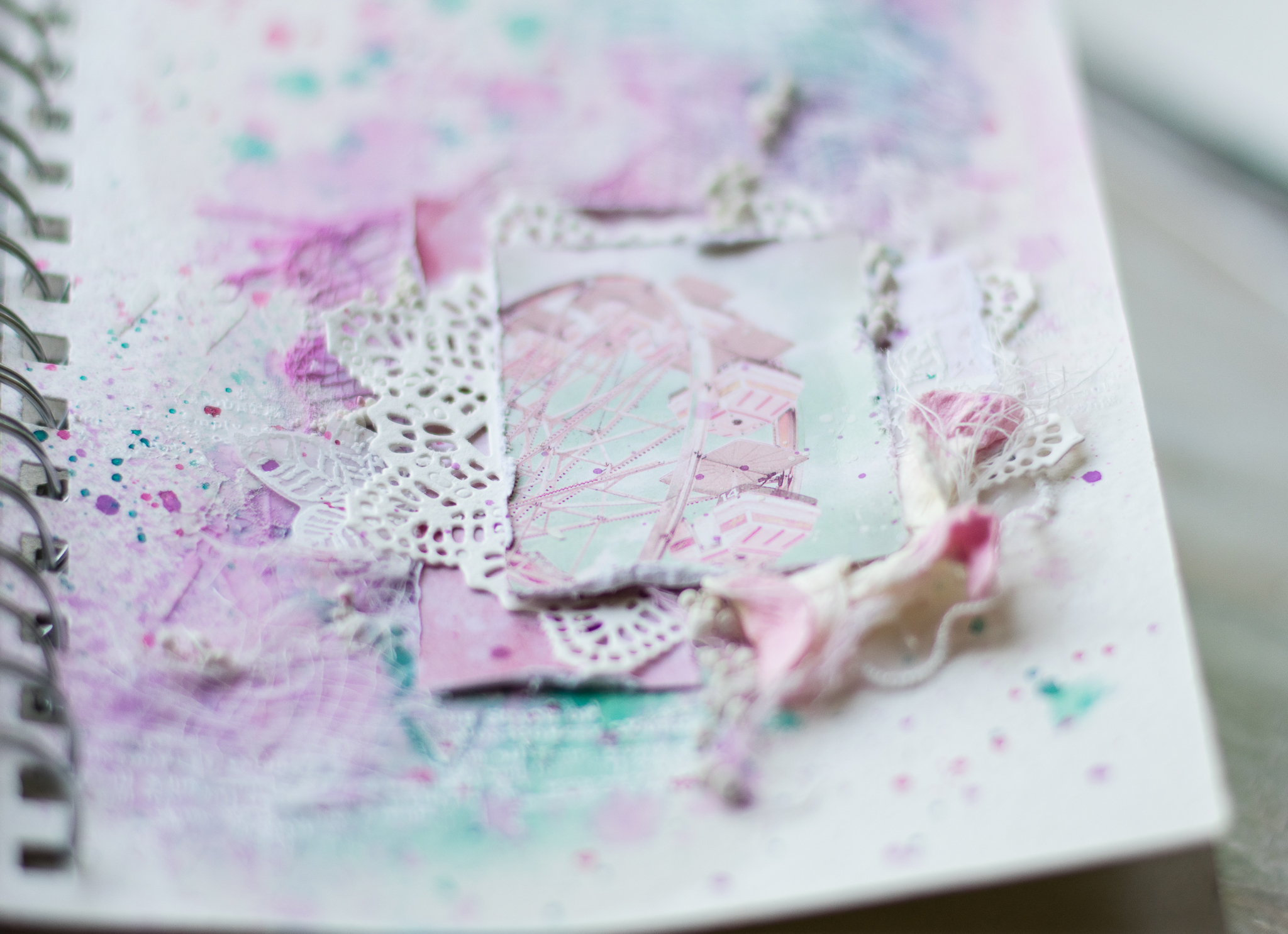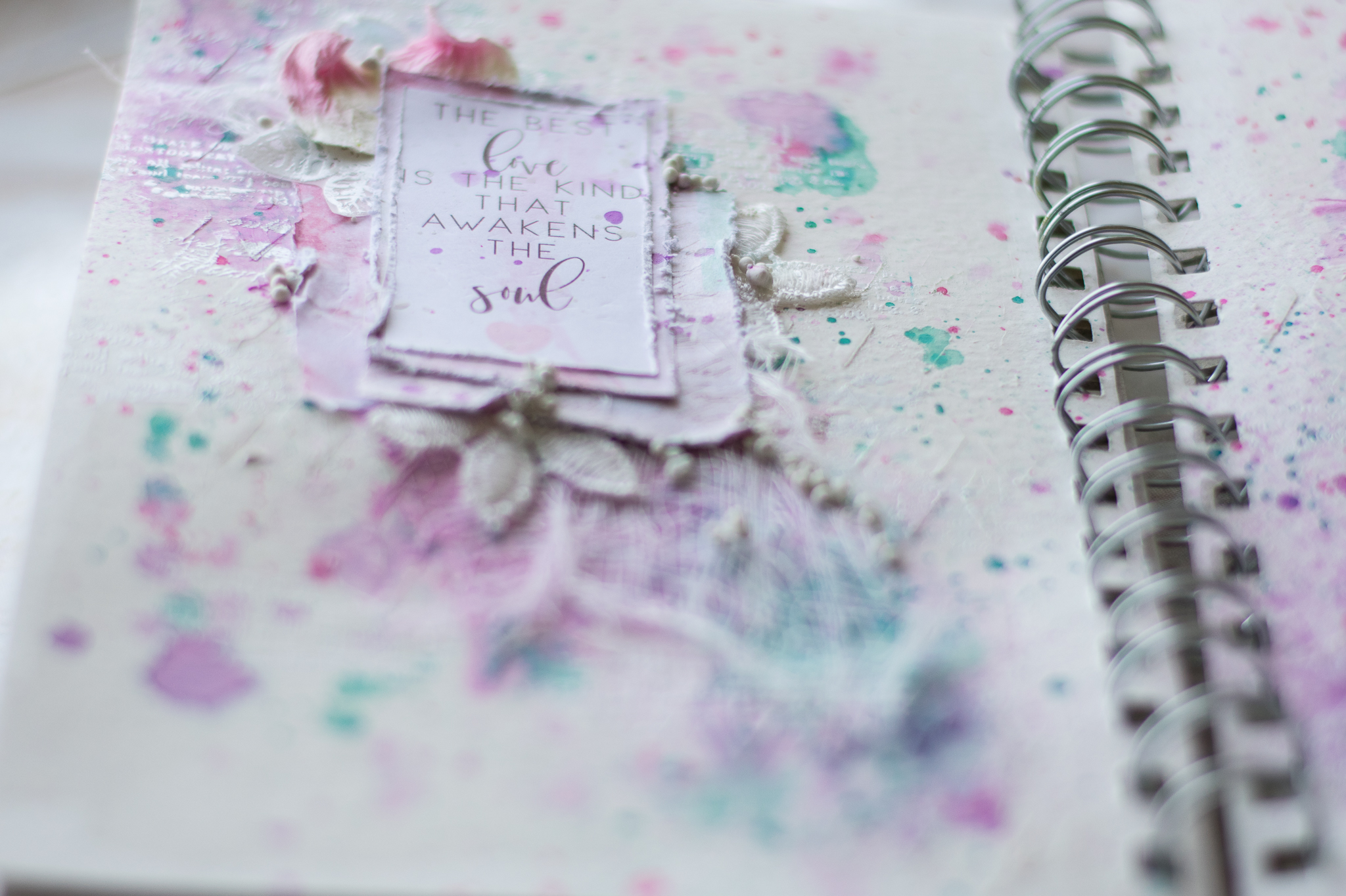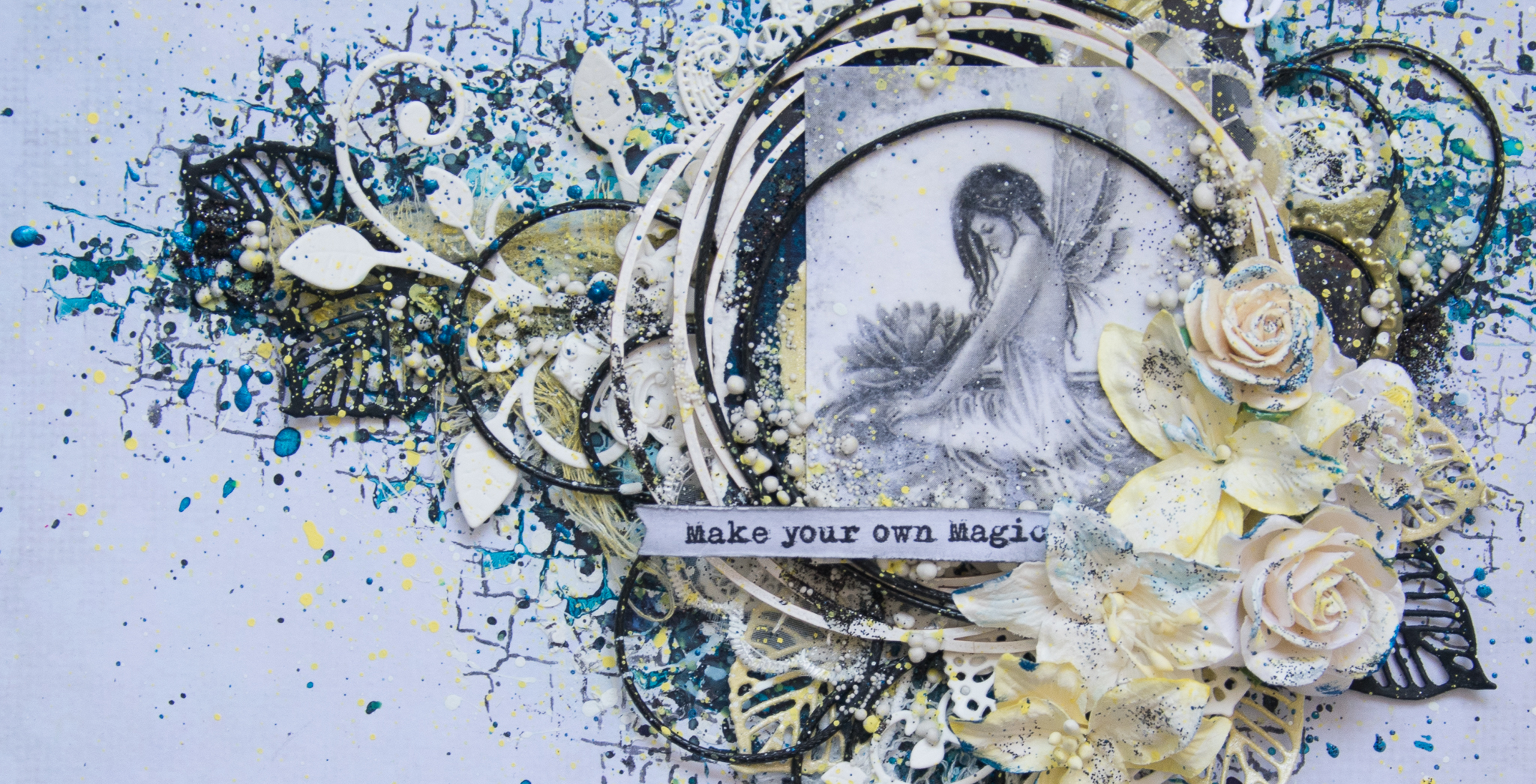 I framed the sentence with a white embossed chipboard, adding scraps paper, cuttings of leaves and flowers, molds and lace.