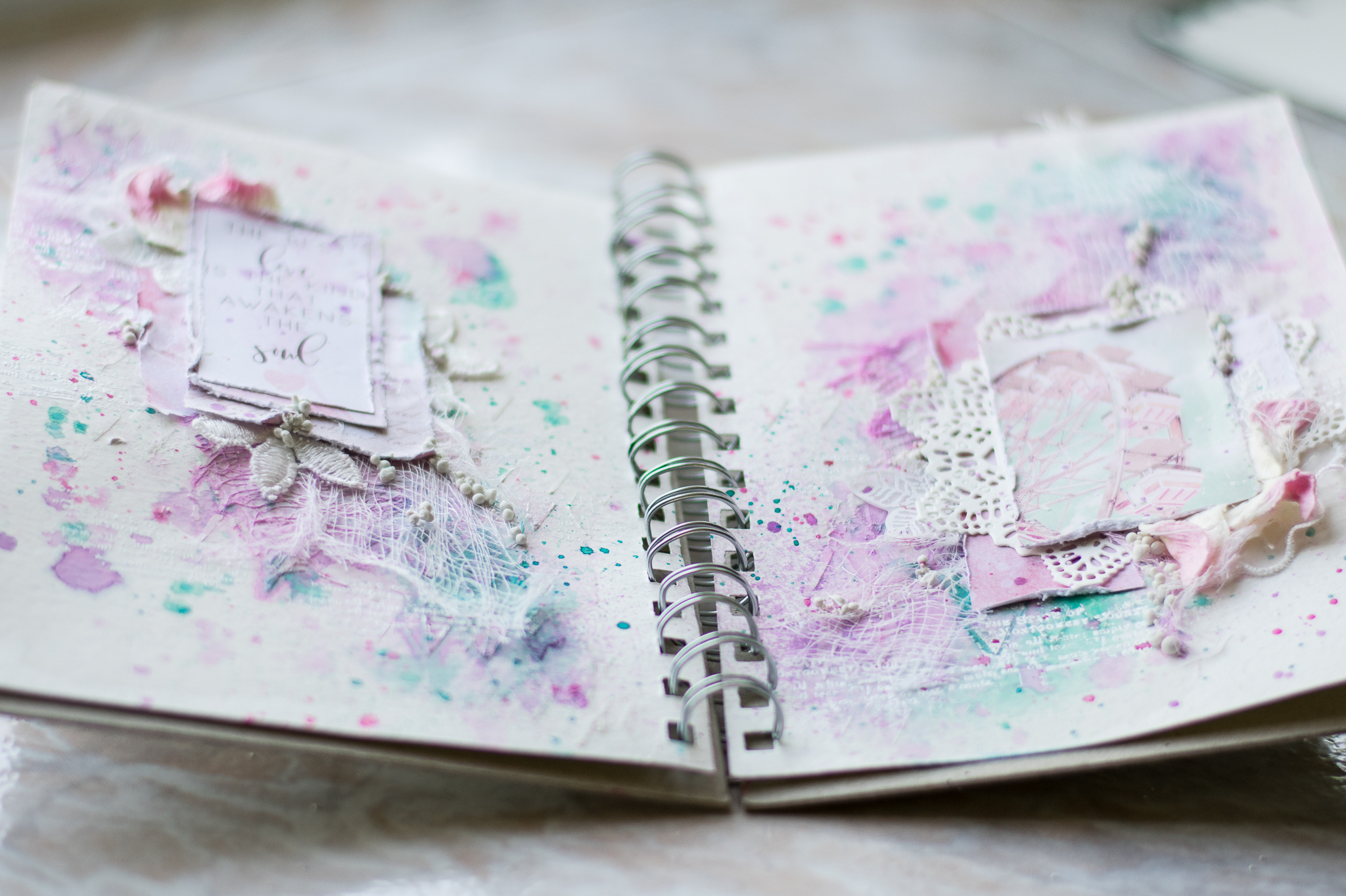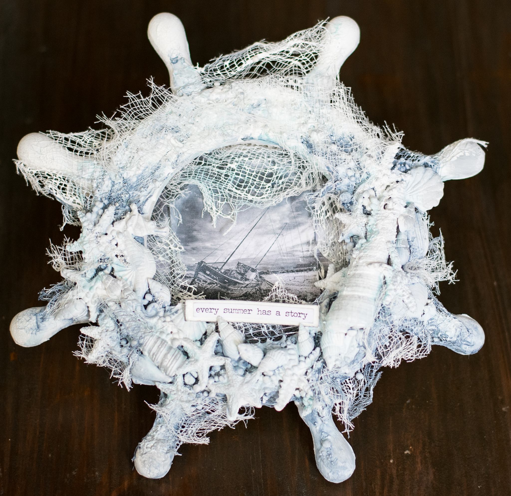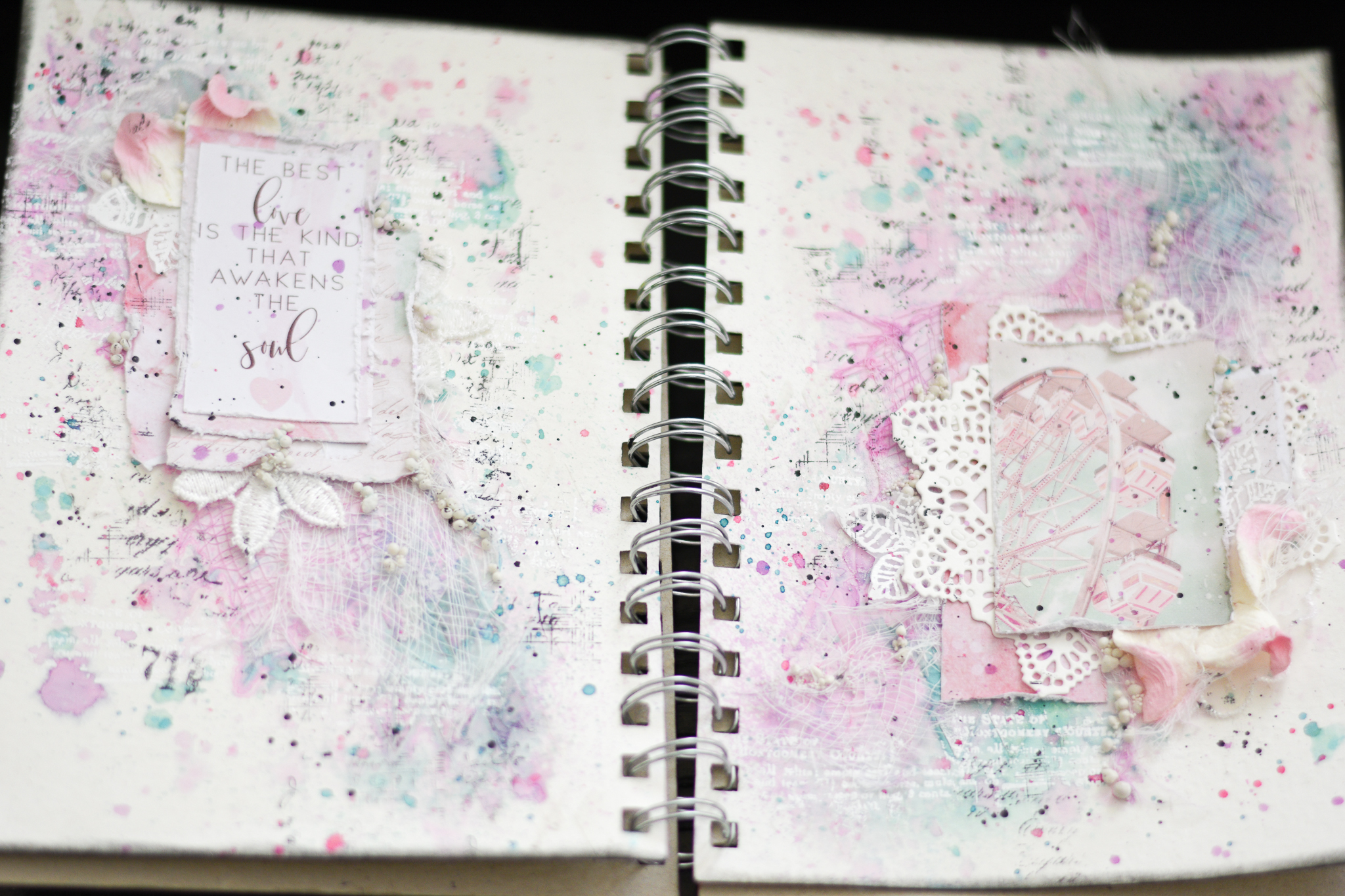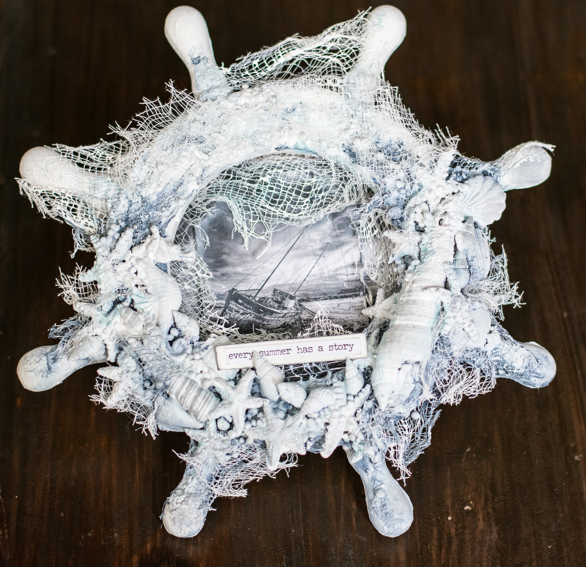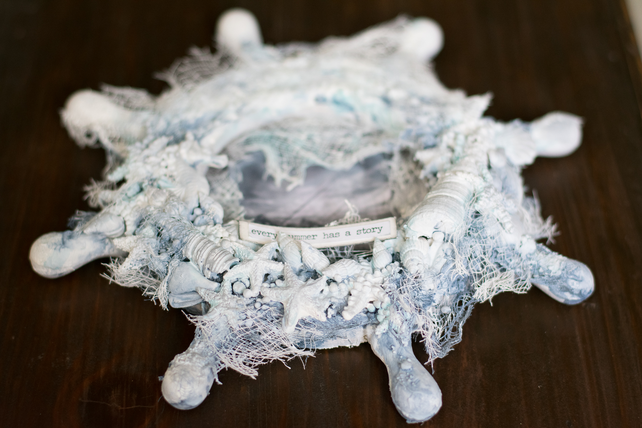 I framed the sentence with a white embossed chipboard, adding scraps paper, cuttings of leaves and flowers, molds and lace.