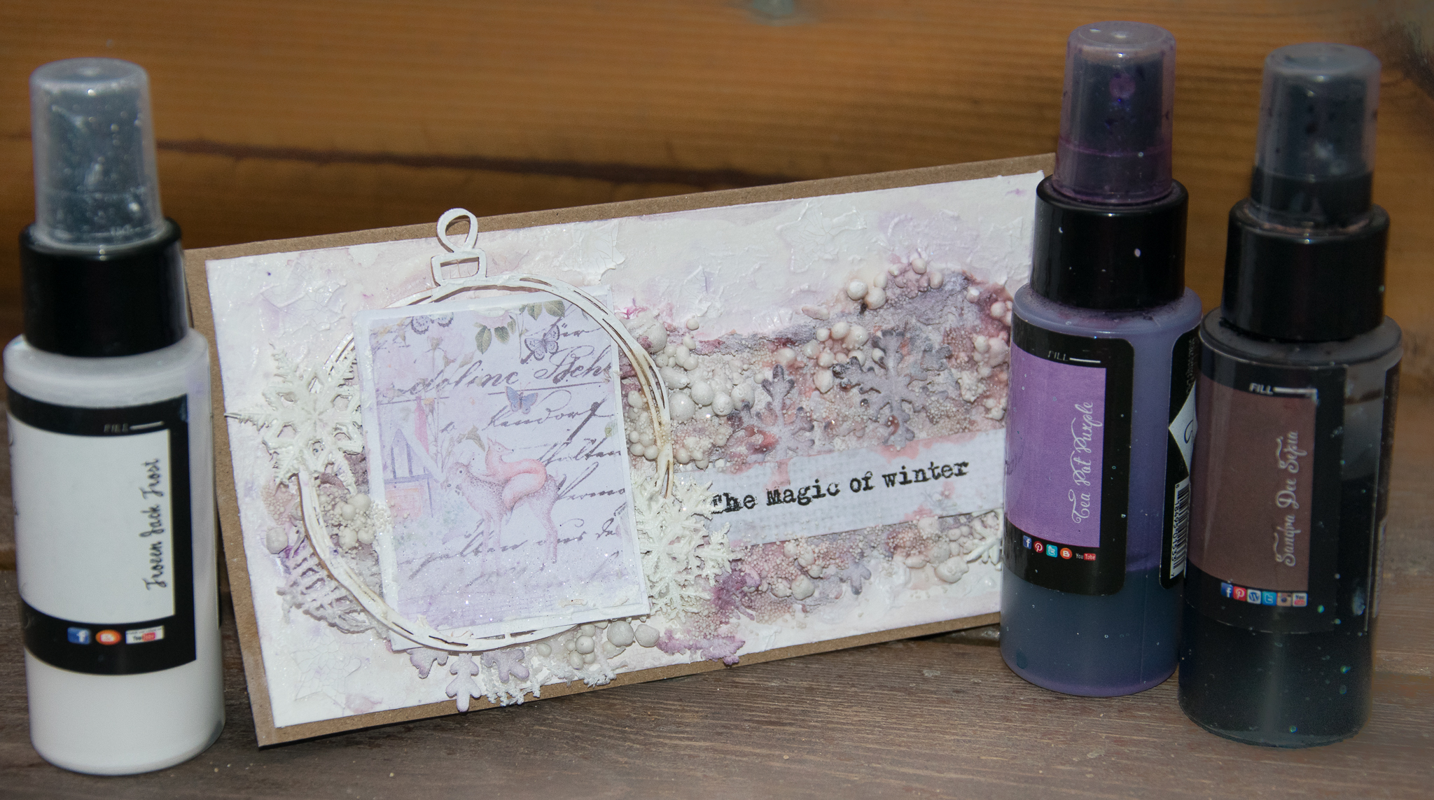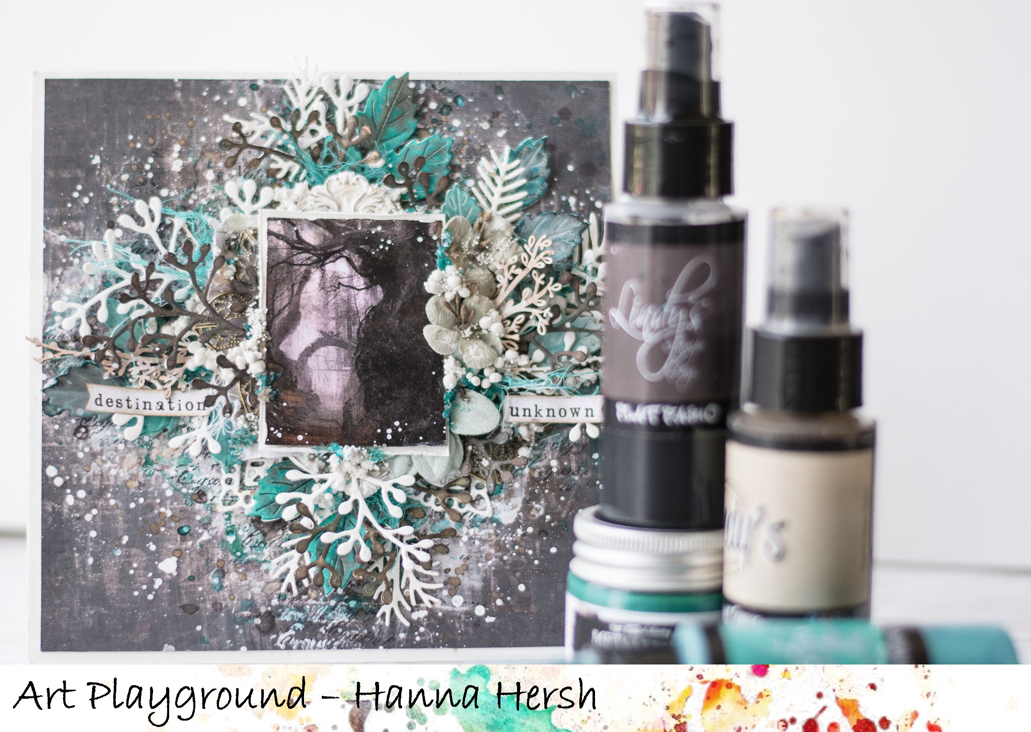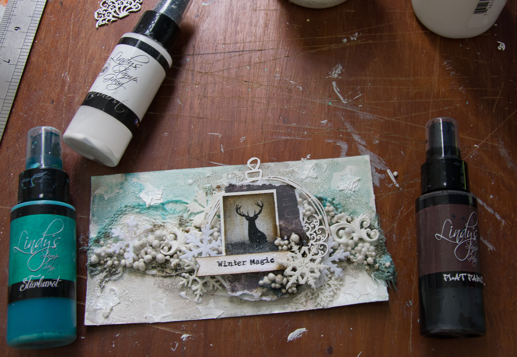 In this one i use'd 3 colors of lindy's mists and tried to use elements that helped me create a cold wintery kind of mood. you can see the all process of my work and the material i have used at the following pictures.