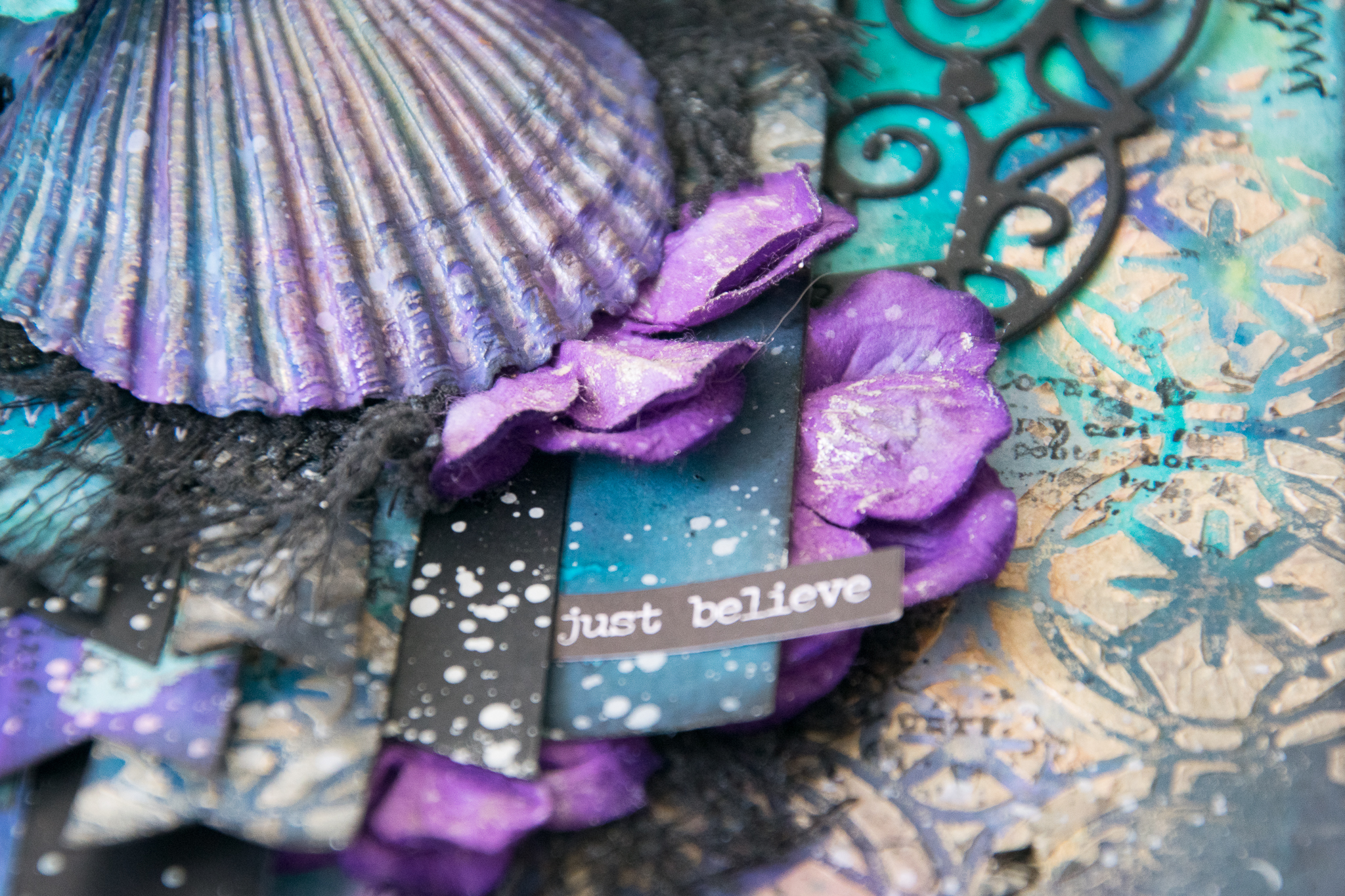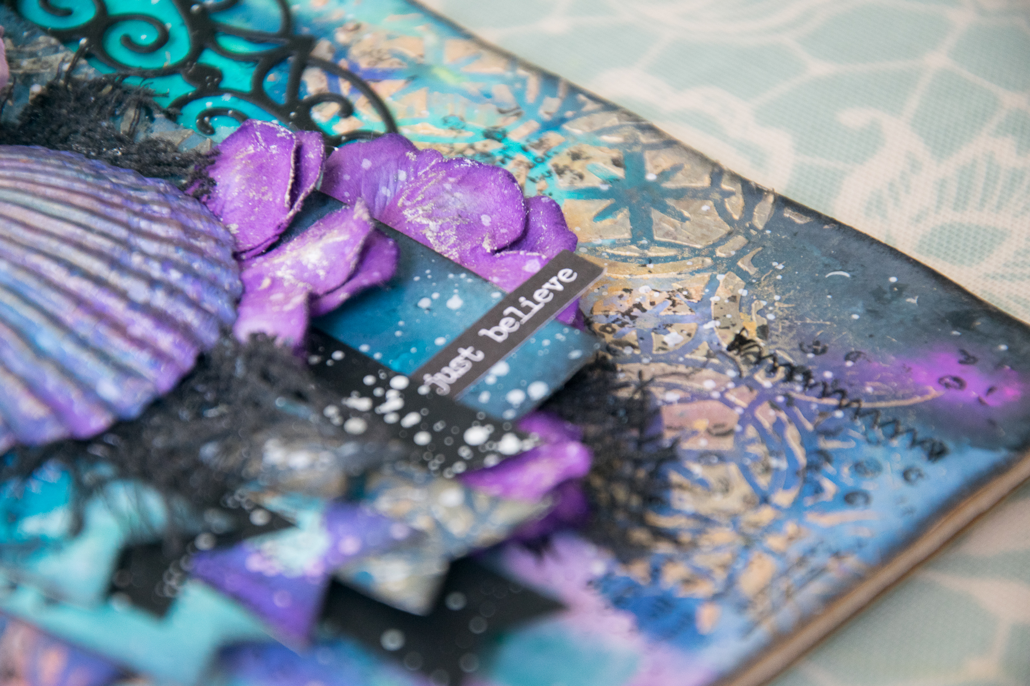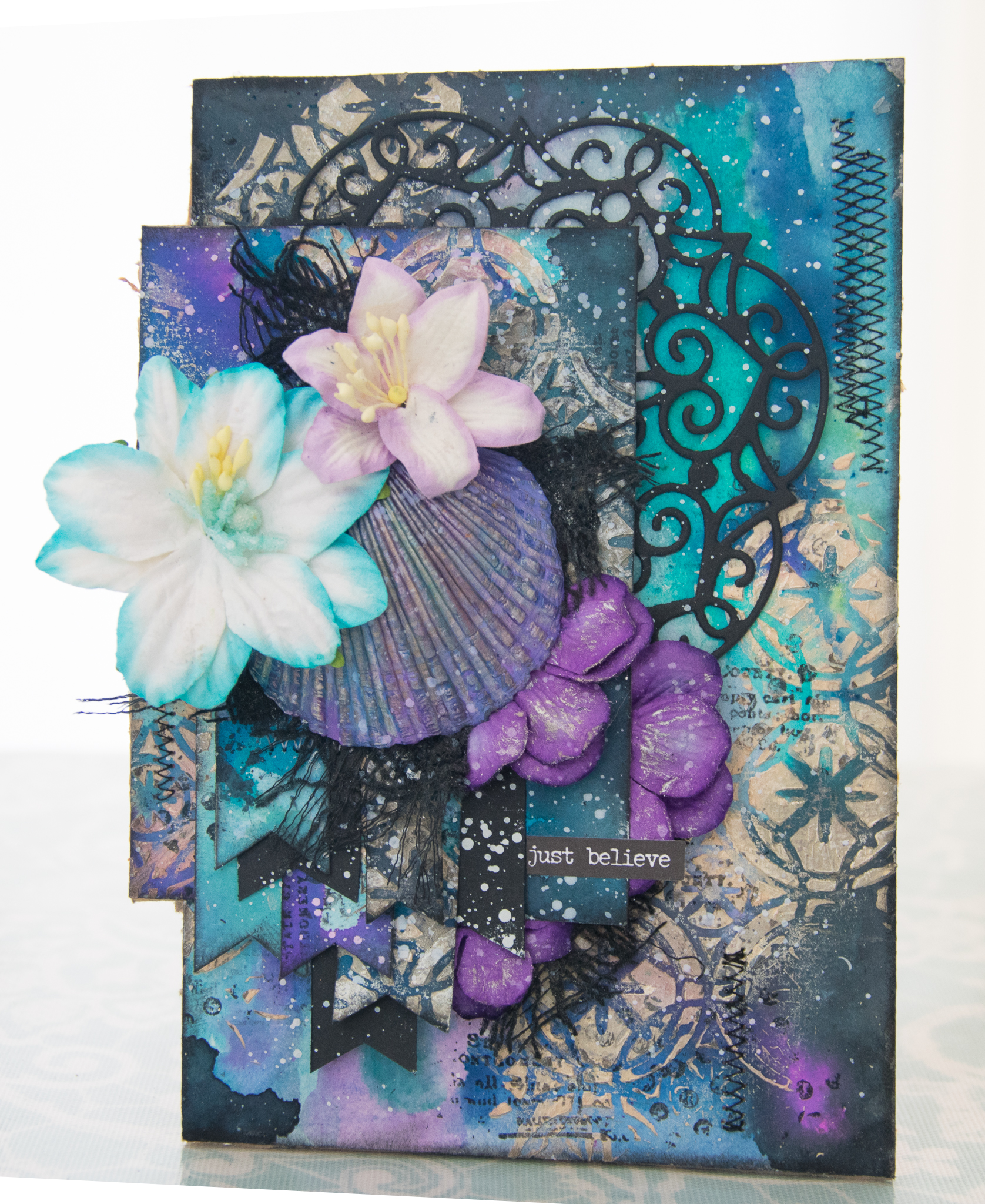 I was inspired by a few things in the mood board. first, the gorgeous palette of blue, purple, black and gold which guided me to make the background with the help of lindy's stampgang mists.