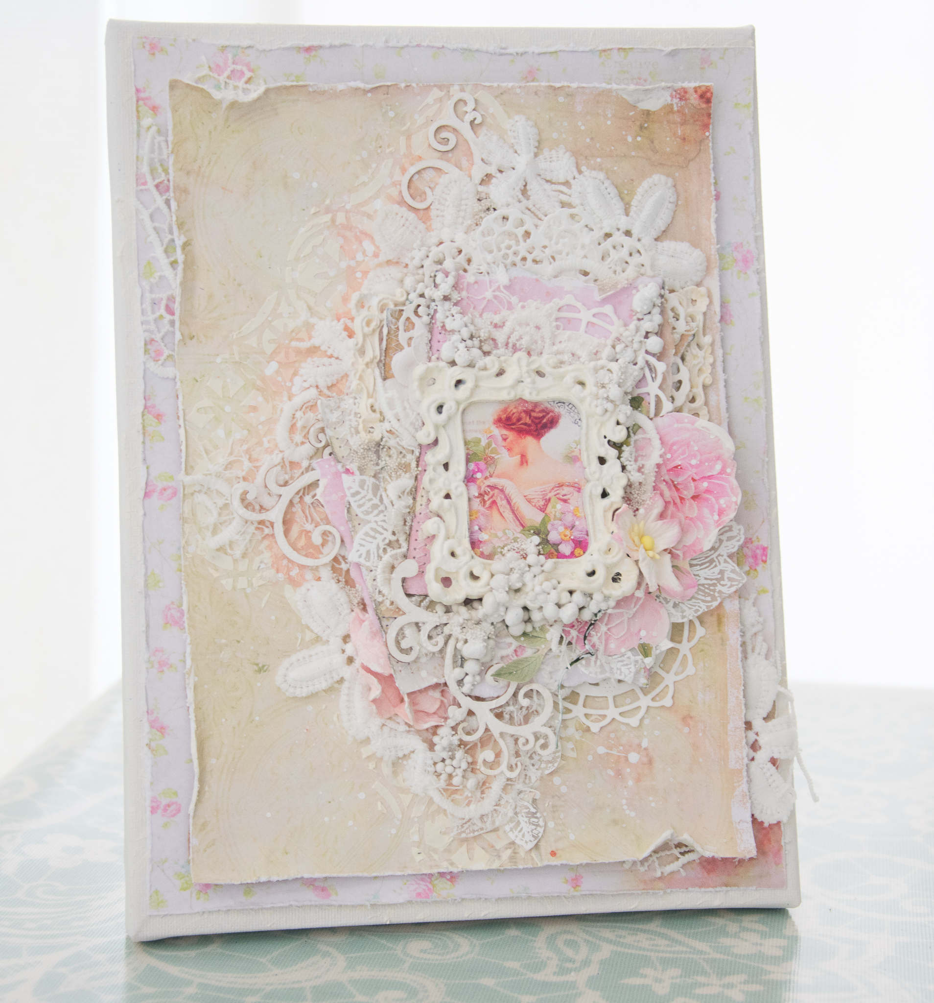The soft colors, the layers, disstresing and combining lace fabric to get an old kind of look, were all that i have tried to implement in my canves.